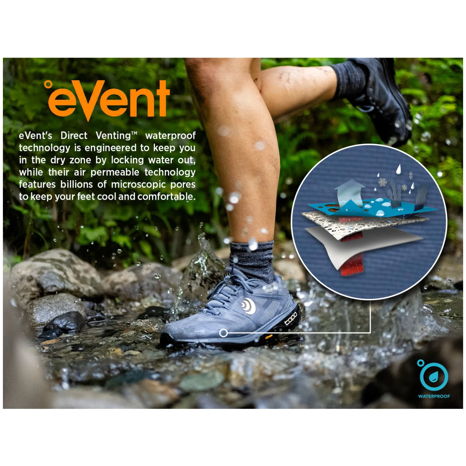 Adidașii de trail pentru femei Terraventure 4 WP de la Topo au o platformă mărită pentru o amortizare și mai mare și protecție sub picioare, cu o flexibilitate îmbunătățită a degetelor pentru o tranziție rapidă și o alergare lină. Talpa intermediară este îmbunătățită cu o nouă spumă cu memorie ZipFoam™ pentru un echilibru perfect între amortizarea moale și reculul rapid, în timp ce talpa Vibram® Megagrip oferă o tracțiune și aderență excelentă. Ghetele au, de asemenea, o construcție impermeabilă eVent®, astfel încât picioarele tale vor rămâne complet uscate și confortabile chiar și pe vreme umedă.