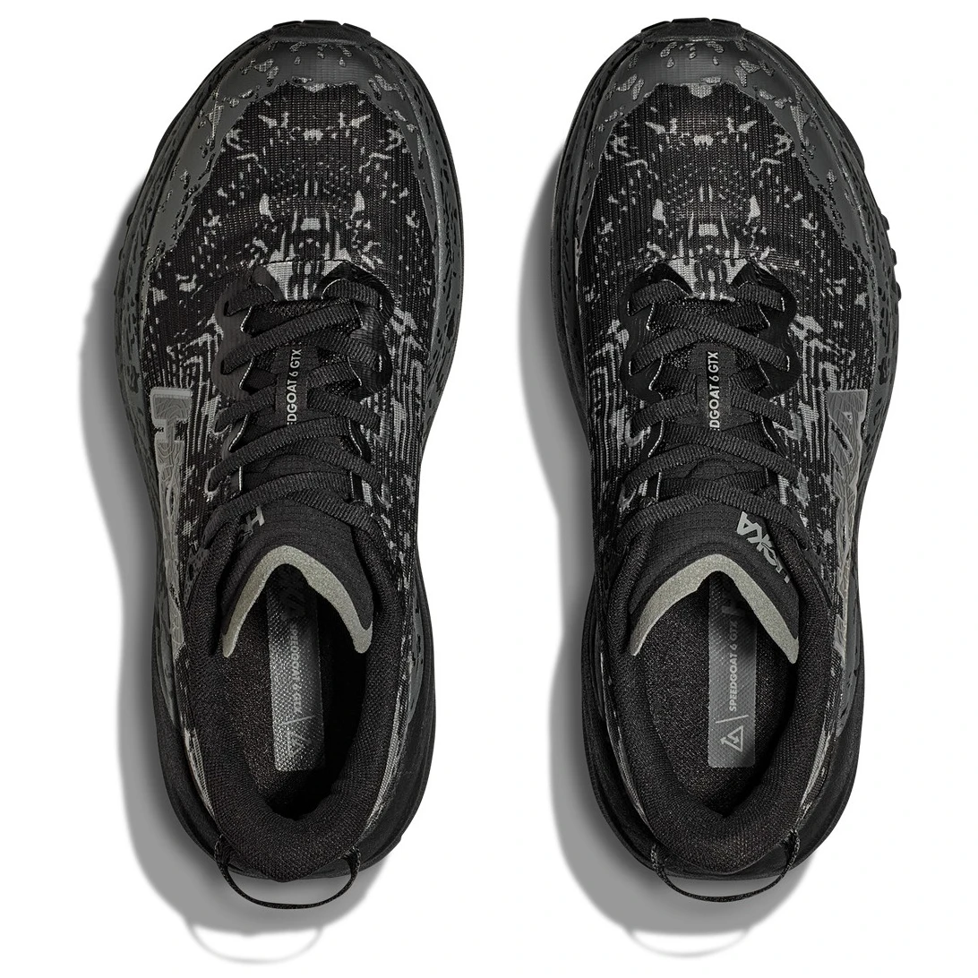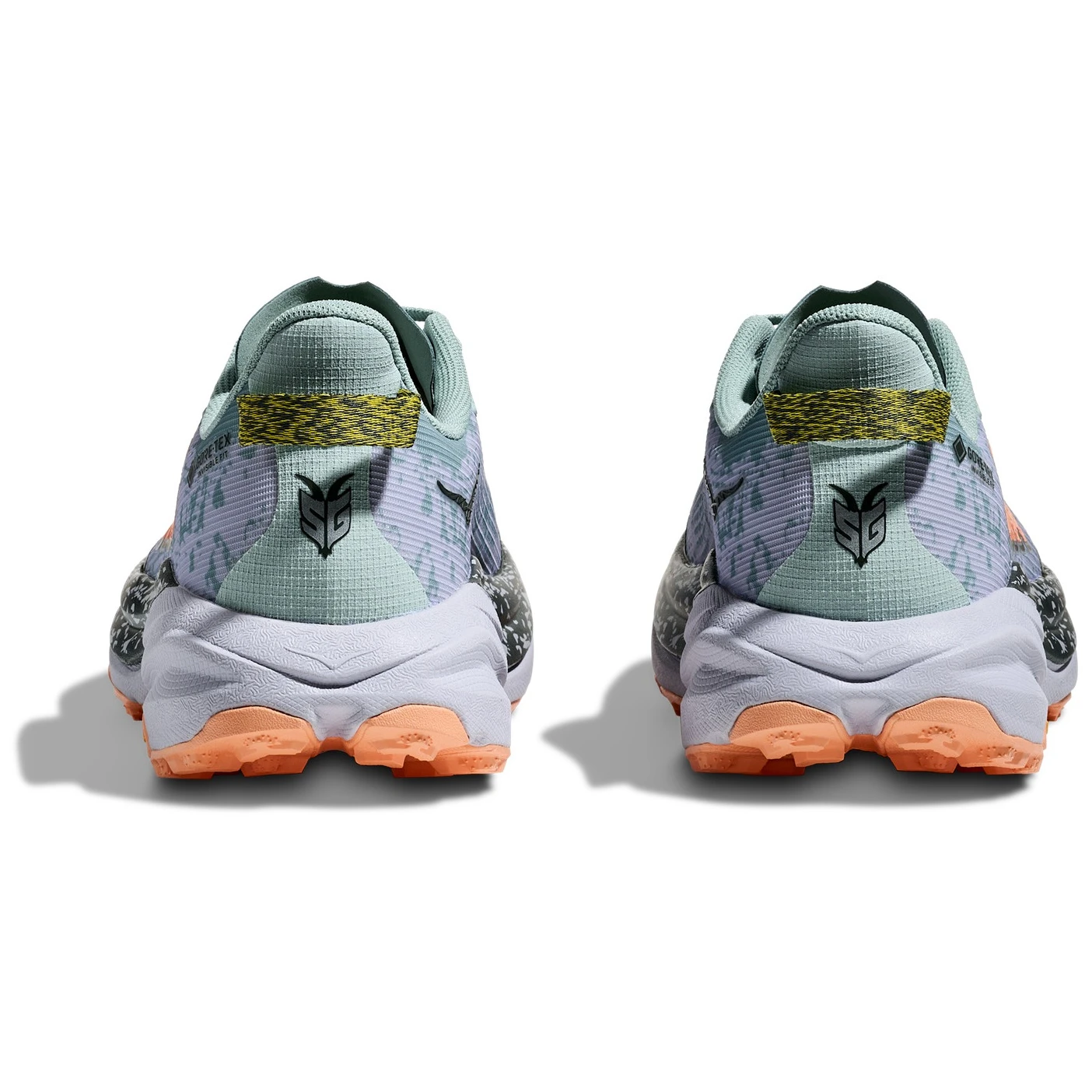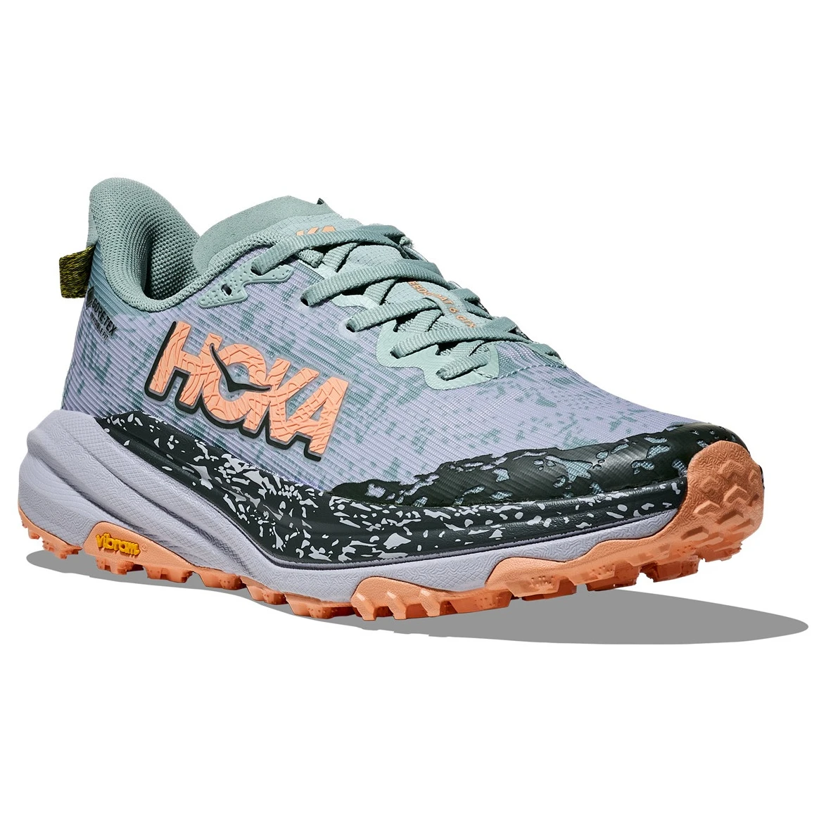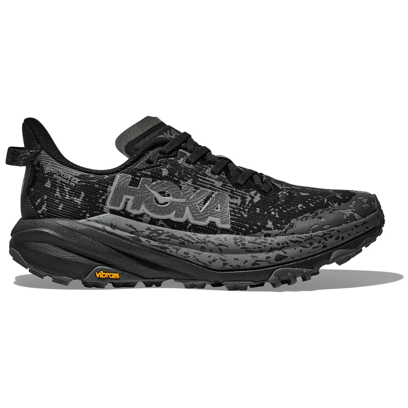 Pantofii de alergare Speedgoat 6 GTX de la brandul Hoka sunt proiectați pentru trasee tehnice. A șasea generație oferă greutate redusă și mai multă tracțiune ca niciodată. Se îmbină de la talpă până la șireturi cu o talpă intermediară Vibram® Megagrip și cu Traction Lug pentru o aderență îmbunătățită pe teren accidentat. Speedgoat 6 păstrează aceeași înălțime a tălpii și aceeași formă rocker (curbura tălpii exterioare), folosește un compus mai ușor al tălpii intermediare și o plasă jacquard mai groasă în două straturi care inspiră încredere pe orice teren .