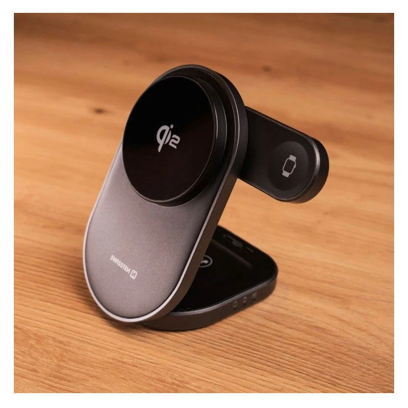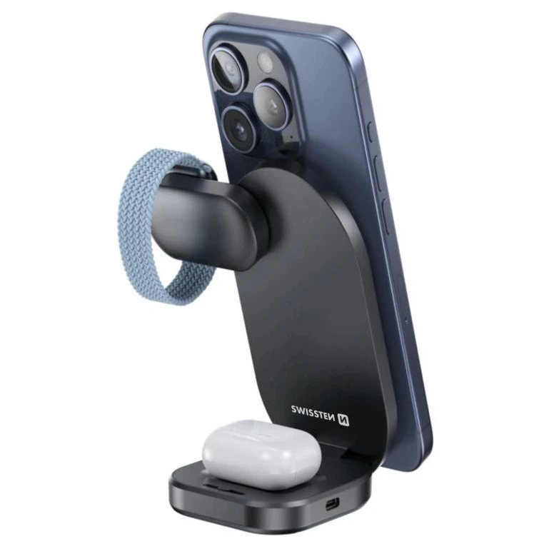 Încărcătorul elegant wireless Swissten MagBase 3-în-1 cu tehnologie Qi2 va încărca iPhone, Apple Watch și căști simultan – rapid, sigur și fără dezordine de cabluri.