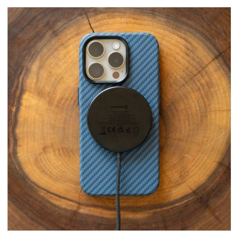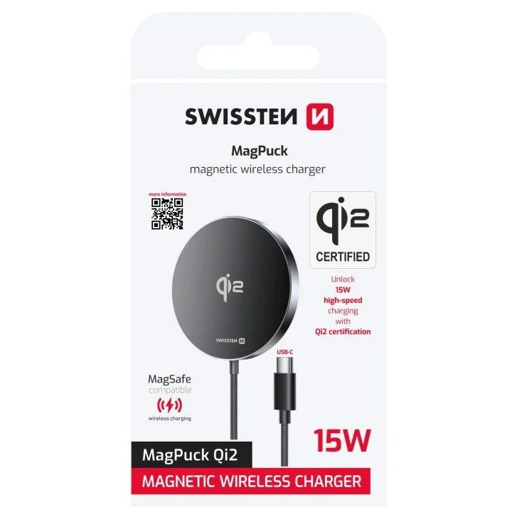 Încărcătorul modern wireless Swissten MagPuck cu suport Qi2 oferă încărcare rapidă, sigură și elegantă pentru iPhone, Samsung și alte dispozitive compatibile.