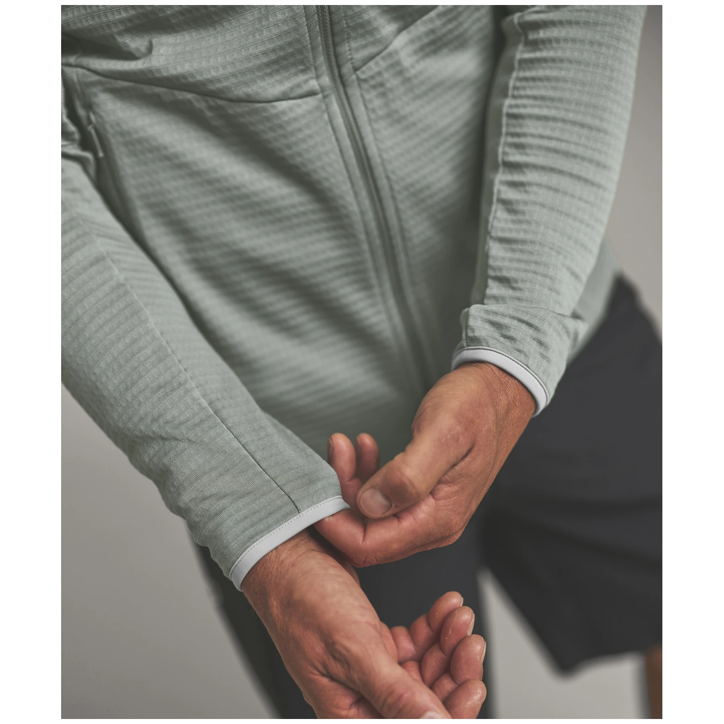 Materialul MERINO FLEECE LIGHT GRID combină fibre sintetice cu lână merino fină, plăcută la atingere, care asigură o reglare optimă a temperaturii și eliminarea umidității. Structura interioară tip gofră (waffle) favorizează ventilația, astfel încât jacheta respiră bine și, în același timp, oferă suficientă căldură chiar și la temperaturi mai scăzute.