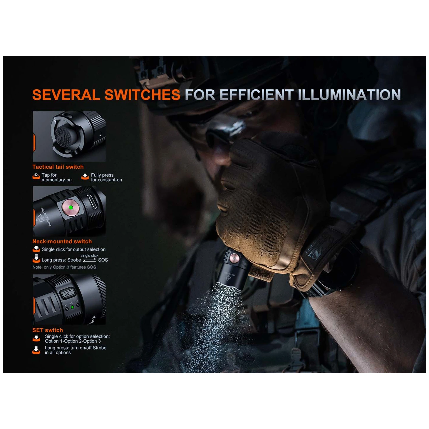 O alegere excelentă nu doar pentru toți pasionații de aer liber, ci și pentru membrii armatei, forțele de securitate sau vânători. Fluxul luminos și timpii de funcționare sunt măsurați cu bateria reîncărcabilă Li-ion Fenix 18650 cu o capacitate de 4000mAh (inclusă în pachet).