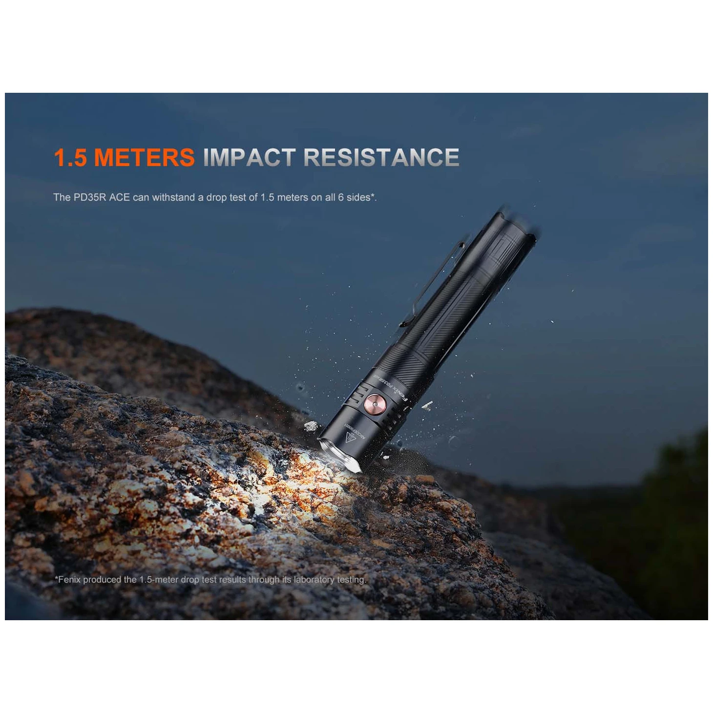 Datorită reglării digitale, lanterna oferă o putere luminoasă constantă chiar și în timpul descărcării treptate a acumulatorului, a cărui stare o puteți verifica cu ușurință cu ajutorul indicatorului de încărcare. PD35R ACE impresionează nu doar prin dimensiunile sale compacte și puterea uimitoare, ci și prin comutatorul tactic și posibilitatea de a conecta comutatorul cu cablu Fenix AER-02.