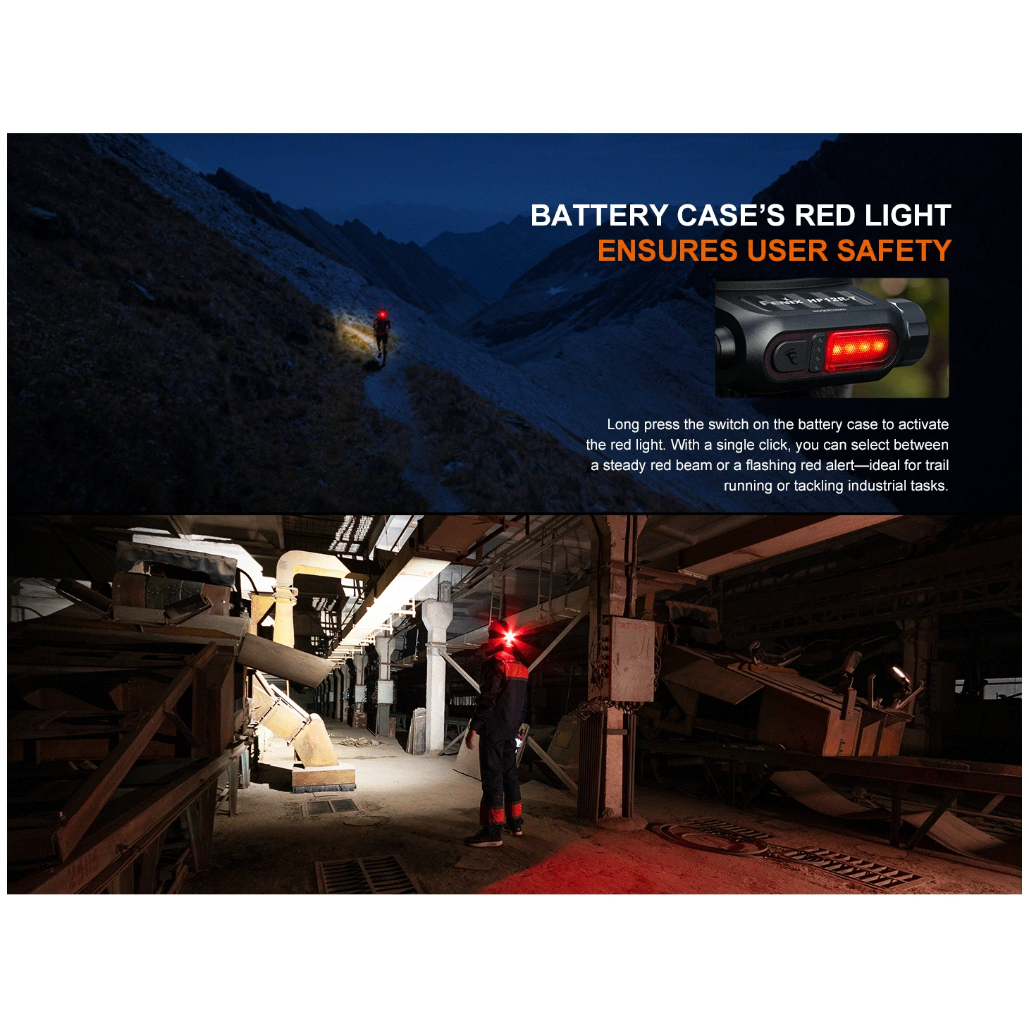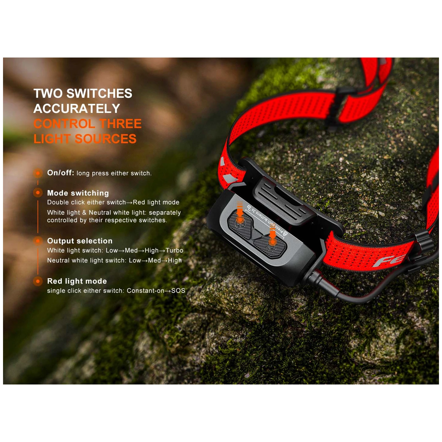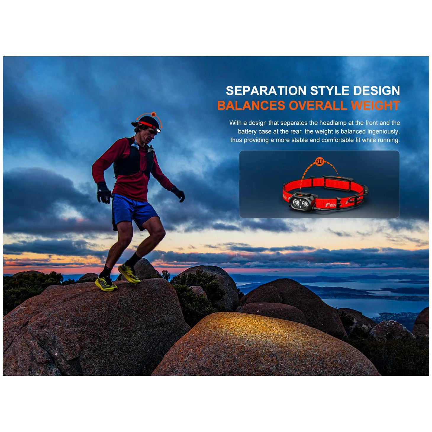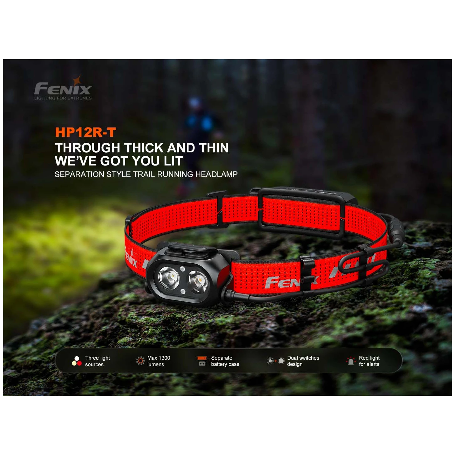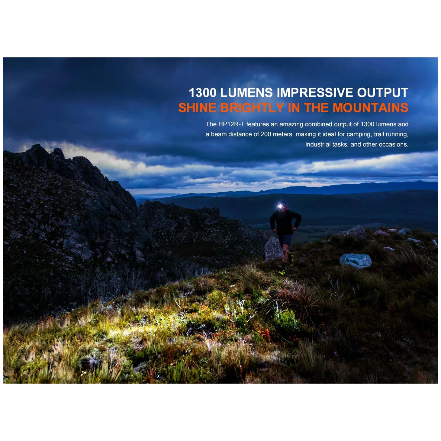 Fenix HP12R-T este o lanternă frontală de înaltă performanță, cu un design practic, care are o carcasă separată la spate pentru baterii. Datorită celor două reflectoare, oferă un flux luminos de până la 1300 lumeni (ANSI) și o rază de acțiune de până la 200 de metri. Reflectoarele produc fascicule de lumină bine focalizate, care luminează în același timp de aproape și de departe.