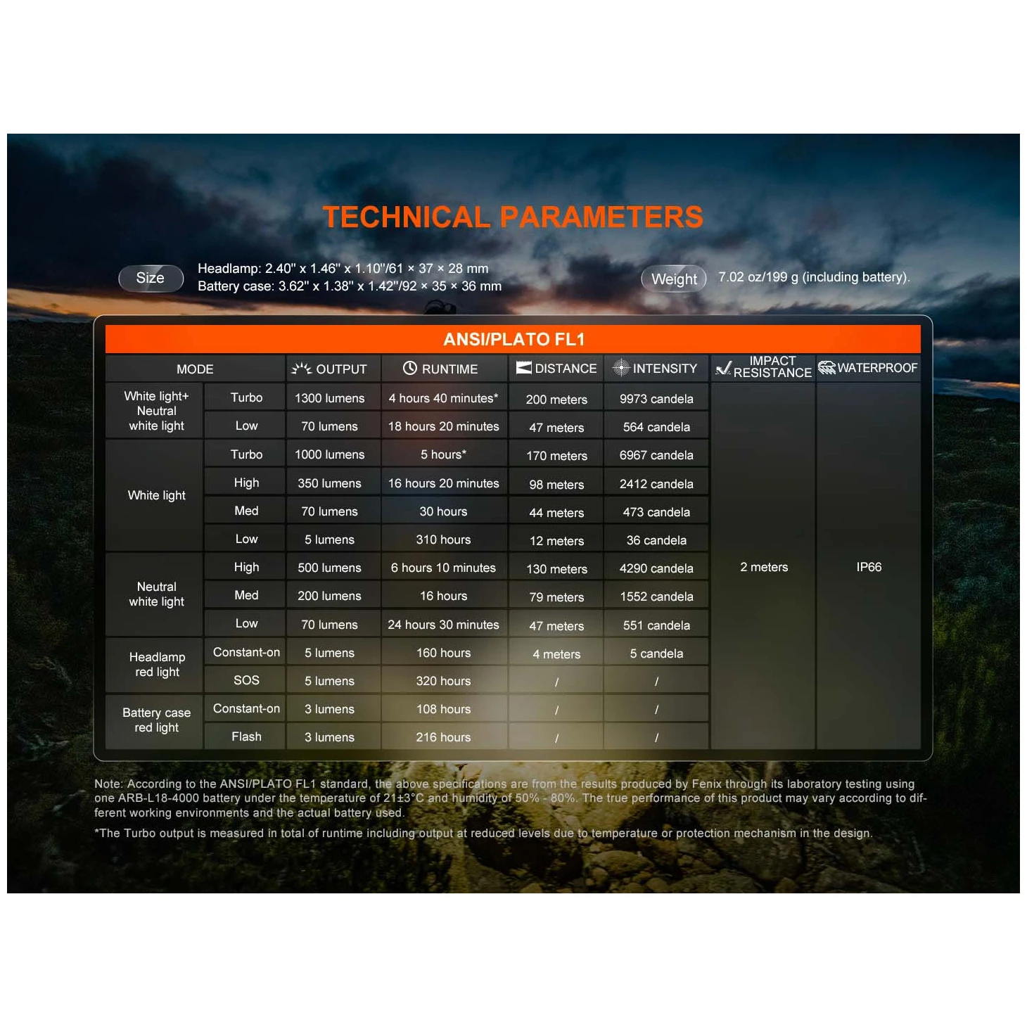 Reflectorul principal oferă patru moduri de iluminare (până la 1300 lm), iar al doilea reflector trei moduri (până la 500 lm). Pentru performanțe maxime, ambele reflectoare pot fi pornite simultan în modul turbo (1300 lm) sau în modul redus (70 lm). Pentru siguranță și situații speciale, lanterna frontală este echipată și cu lumină roșie frontală, bliț SOS roșu și lumină roșie și bliț pe carcasa bateriei din spate.