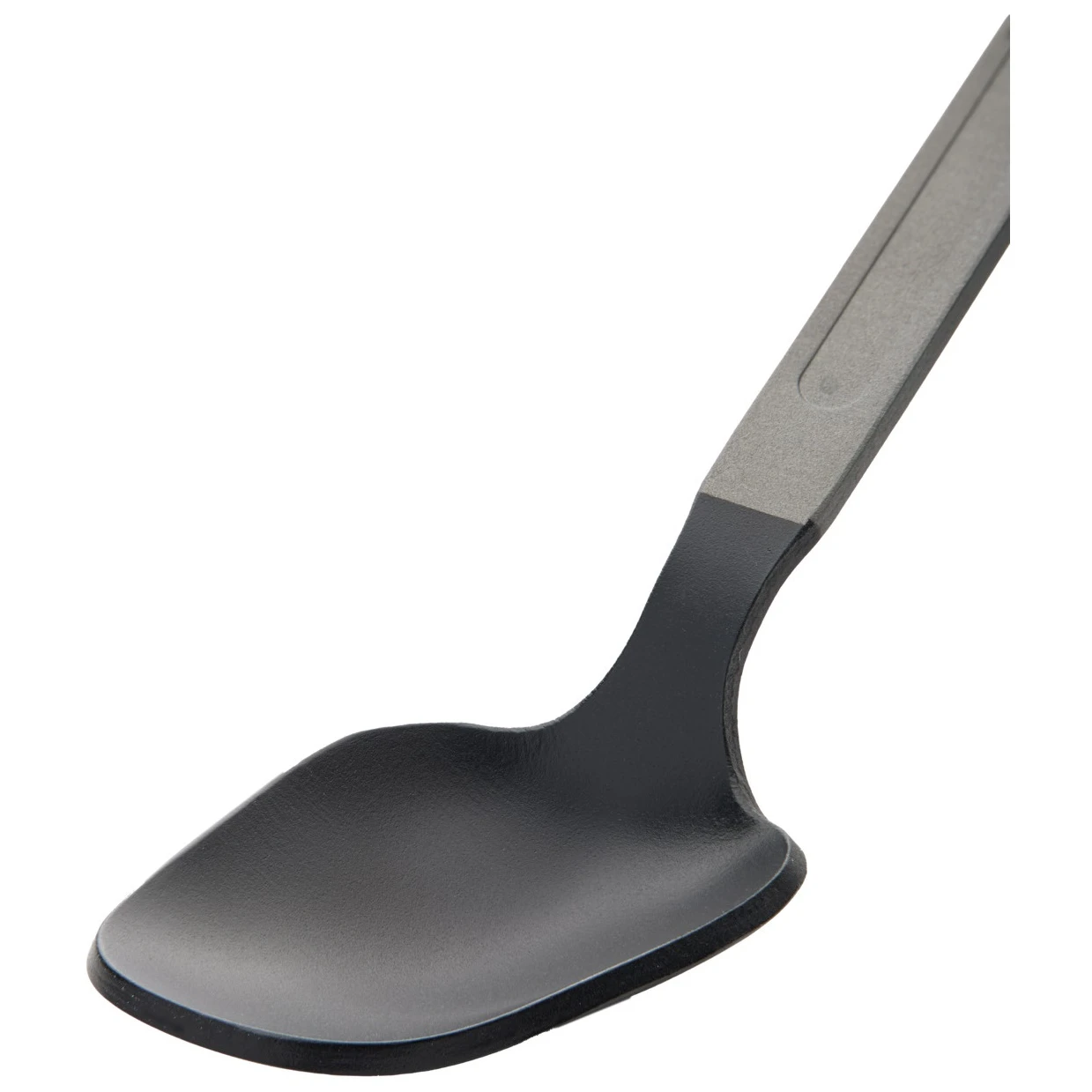 Mânerul practic, prelungit și forma ergonomică permit amestecarea ușoară a alimentelor în oala de gătit, fără a vă opări degetele. De asemenea, datorită acesteia, puteți scoate cu ușurință alimentele din plicuri. Lingura este fabricată dintr-o singură bucată de aluminiu eloxat, care se caracterizează prin greutate redusă, rezistență sporită și durată lungă de viață. Un avantaj este și spălarea ușoară. Lingura este potrivită și pentru mașina de spălat vase.