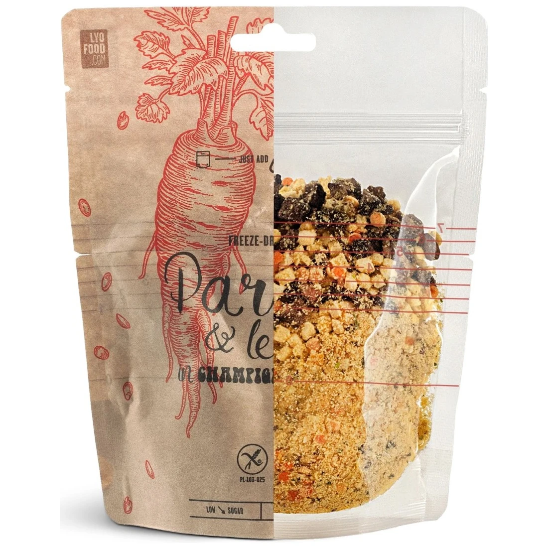 Felul principal liofilizat preparat din ingrediente 100% naturale Lyo food cu aromă de păstârnac și linte este potrivit și pentru vegetarieni și vegani.