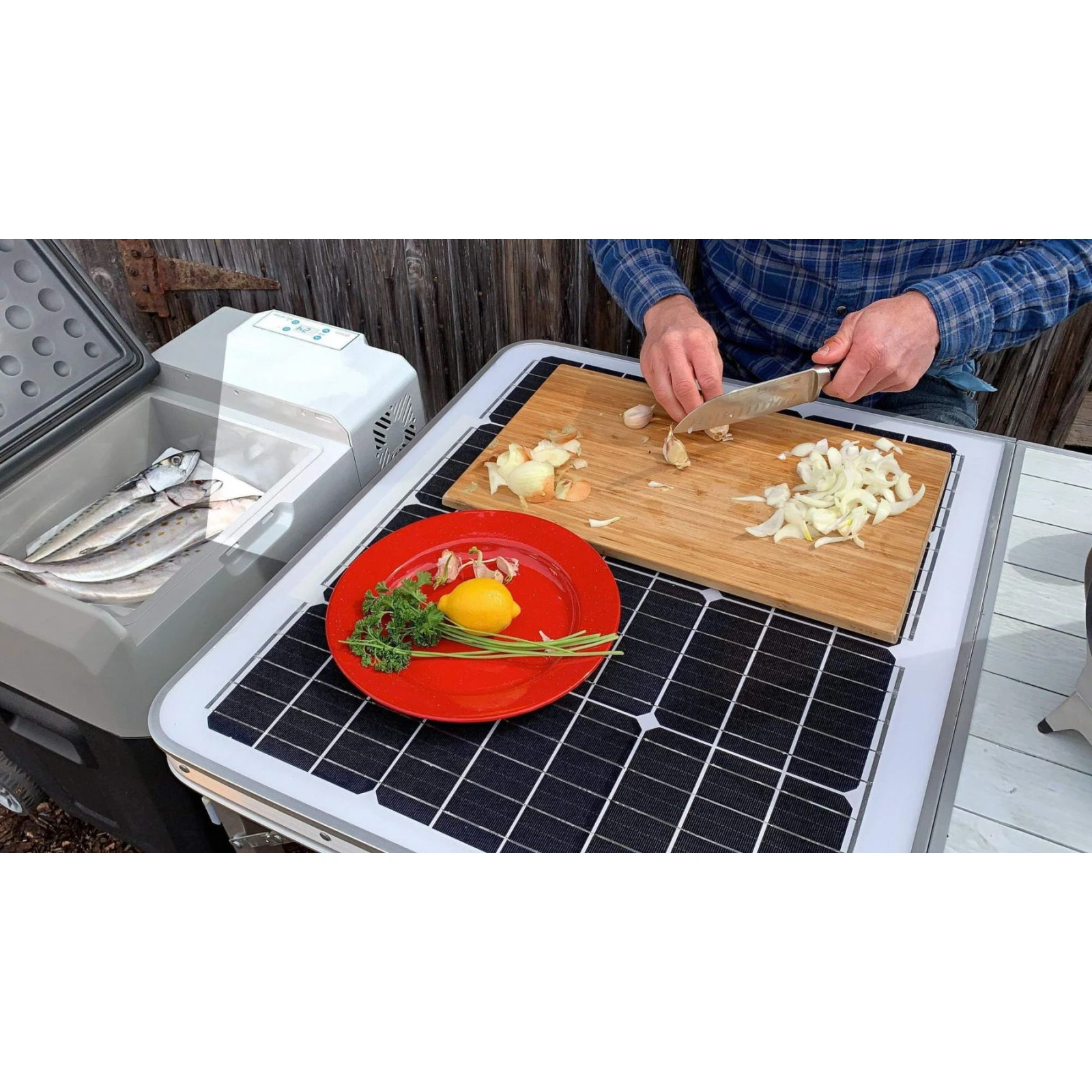 Masa de călătorie pentru camping GoSun, cu panou solar, cu o capacitate de până la 60 W, va deveni principala sursă de încărcare a dispozitivelor dvs electronice atunci când călătoriți sau vă aflați la cabană. Masa este ușoară și compactă, cu un sistem de baterii PowerBank care permite un sistem de alimentare și răcire complet portabil. Puteți seta masa la trei înălțimi, în funcție de necesități. Ideală pentru camping, călătorii, gătit independent și pentru utilizarea zilnică.