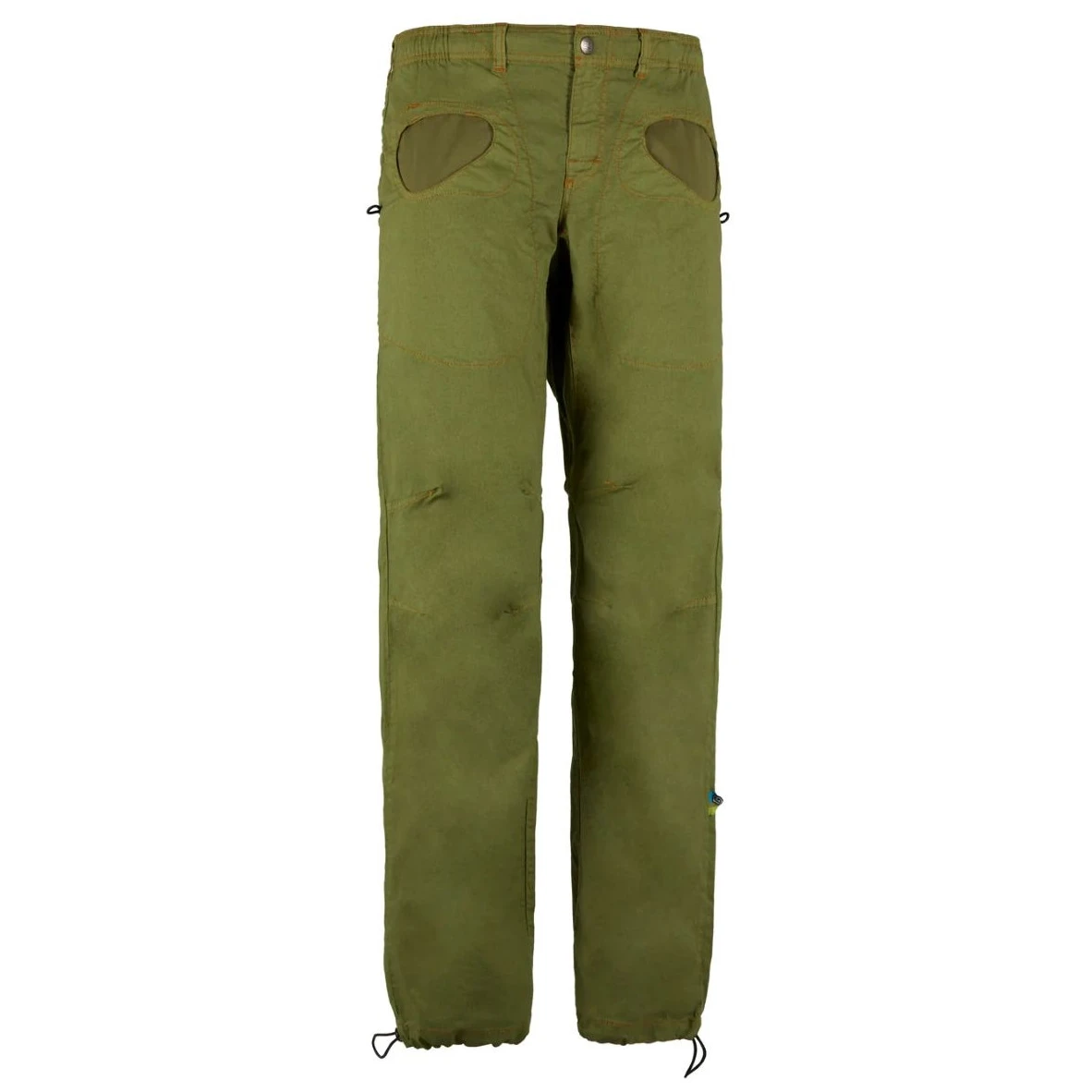 Pantalonii moderni pentru bărbați E9 Rondo Flax2 Men's sunt confecționați din 52% in organic, 46% bumbac organic și 2% elastan.Pantalonii au o talie elastică cu închidere, un tiv inferior reglabil și bucle pentru perie pe ambele părți. Buzunarele au un design ușor contrastant (materialul interior este într-o culoare contrastantă), iar pe buzunarul din spate este brodat logo-ul E9. Sunt fabricați în Italia, cu o poluare minimă a mediului și cu accent pe un design extravagant, un design unic și confort în timpul cățărării.