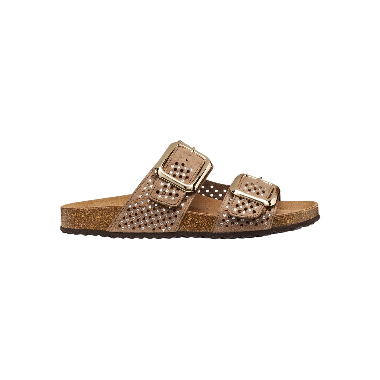 Pantofii de damă Geox Brionia R impresionează prin aspectul lor luxos, accentuat de partea superioară metalizată. Două benzi late, decorate cu ținte și catarame decorative în aceeași nuanță, conferă încălțămintei un caracter distinctiv și stilat. Acest model este ideal pentru femeile care doresc să îmbine confortul cu un stil elegant de vară.
