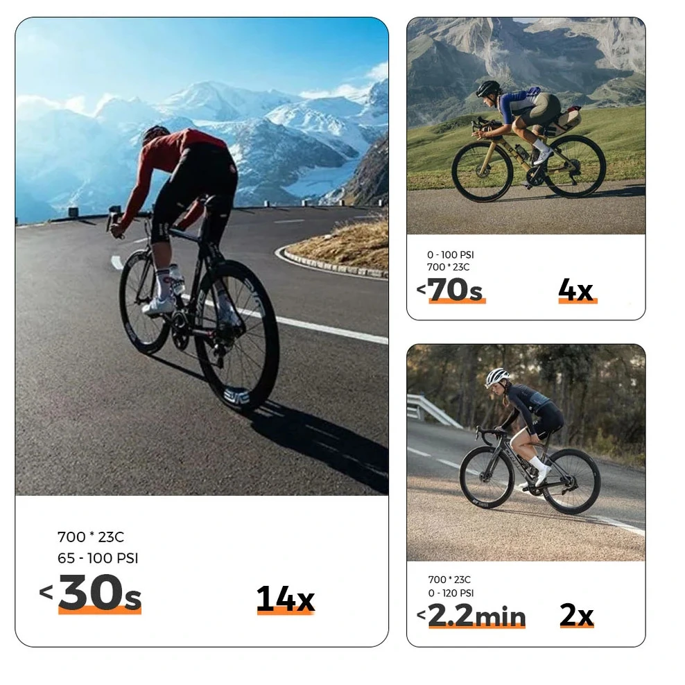 Flextail TINY Tire Pump ACS este incredibil de compactă și cântărește doar 125 de grame. În ciuda dimensiunilor sale minuscule, poate umfla anvelopele până la 120 psi (827 kPa) – ideală și pentru bicicletele de șosea. Datorită motorului de mare viteză, poate face față umflării rapide fără efort.