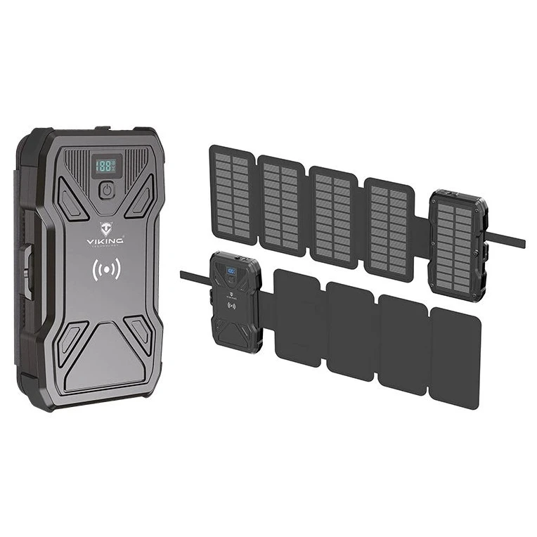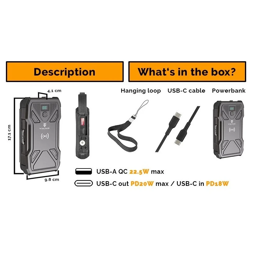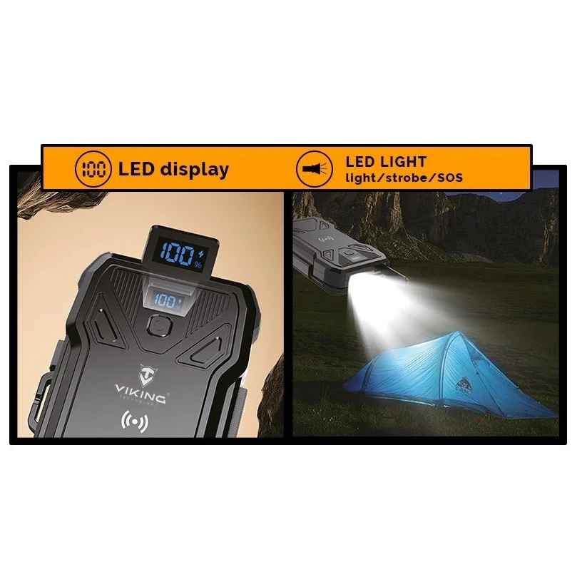 Există, de asemenea, o lanternă LED integrată cu 3 moduri (inclusiv SOS și stroboscop), un afișaj LED cu indicator procentual de încărcare și o buclă de agățare pentru un transport ușor. Viking TYR I este partenerul ideal pentru drumeții, camping și călătorii lungi departe de electricitate.