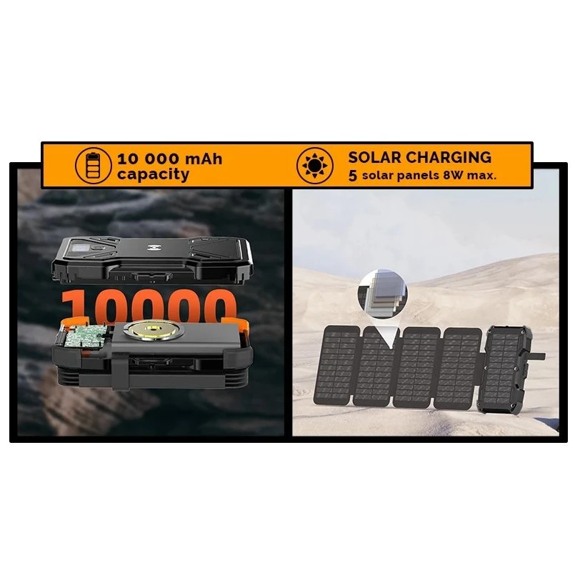 Obține libertate fără a depinde de prize cu Viking Technology TYR I – o baterie externă solară compactă cu o capacitate de 10 000 mAh (37 Wh), care combină rezistența, performanța și ecologia. Datorită panourilor solare extensibile cu o putere de până la 8 W, poate folosi puterea soarelui și poate furniza energie dispozitivelor tale chiar și departe de civilizație.