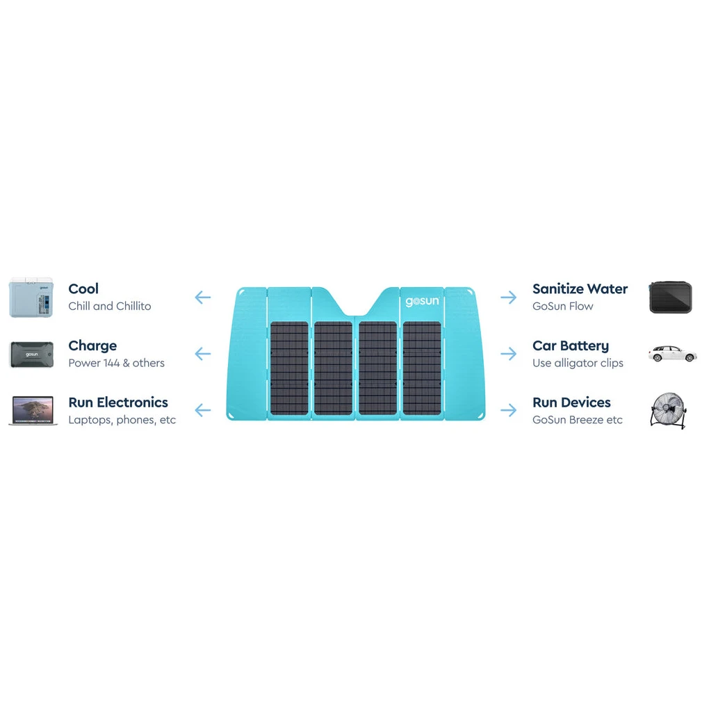 Protejează mașina de supraîncălzire atunci când parcați afară. Se poate folosi ecranul pentru a încărca o baterie auto descărcată, pentru a menține bateria încărcată atunci când nu este utilizată sau pentru a face umbră radiatorului sau altor dispozitive solare în timp ce furnizează energie.Pentru cea mai bună răcire și performanță , se plasează scutul patentat pe partea exterioară a parbrizului autovehiculului. Dispune de conexiuni electrice: 2 porturi USB-A, 1 port USB-C, o pereche de cleme aligator, plus că încarcă orice bancă de alimentare GoSun prin intermediul portului său de 12 V CC.
