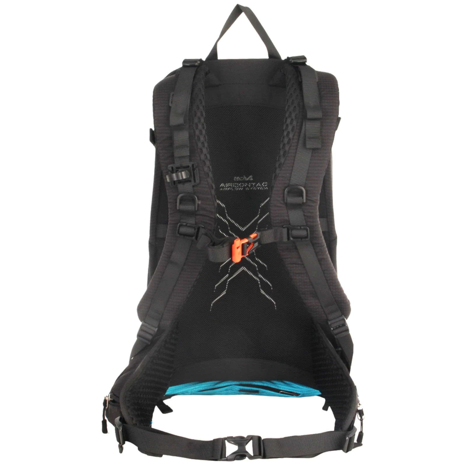 Curelele de umăr cu căptușeală întărită au formă anatomică, cu o curea de piept reglabilă pe înălțime, cu scârțâitor. Cureaua de talie și curelele laterale de compresie asigură așezarea fermă și confortabilă a rucsacului pe spate. Rucsacul are un buzunar principal mare și două buzunare frontale adânci cu fermoar, un buzunar frontal textil și buzunare laterale din plasă pentru sticlă.