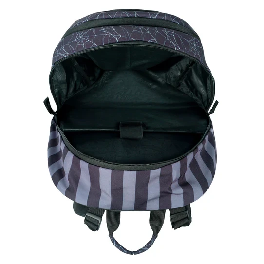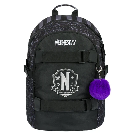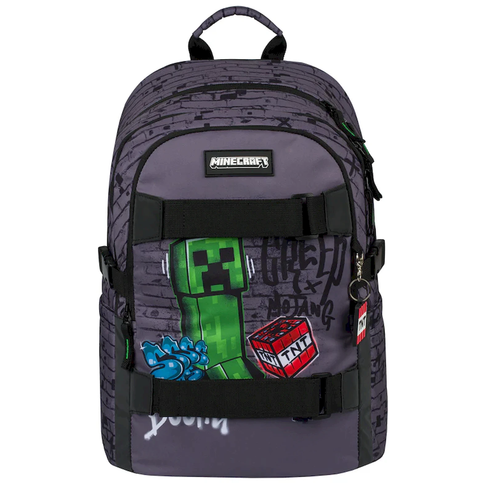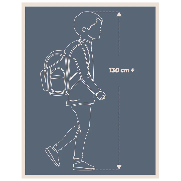 Rucsacul este fabricat dintr-un material robust și impermeabil. Are trei compartimente separate cu fermoar. În interior se află un organizator practic și un buzunar pentru un notebook de 15" sau o tabletă. Cele două buzunare laterale din plasă sunt ideale pentru o sticlă de apă. În față are curele pentru fixarea skateboardului. Elementele reflectorizante plasate pe toate părțile sporesc vizibilitatea copilului în condiții de lumină slabă.