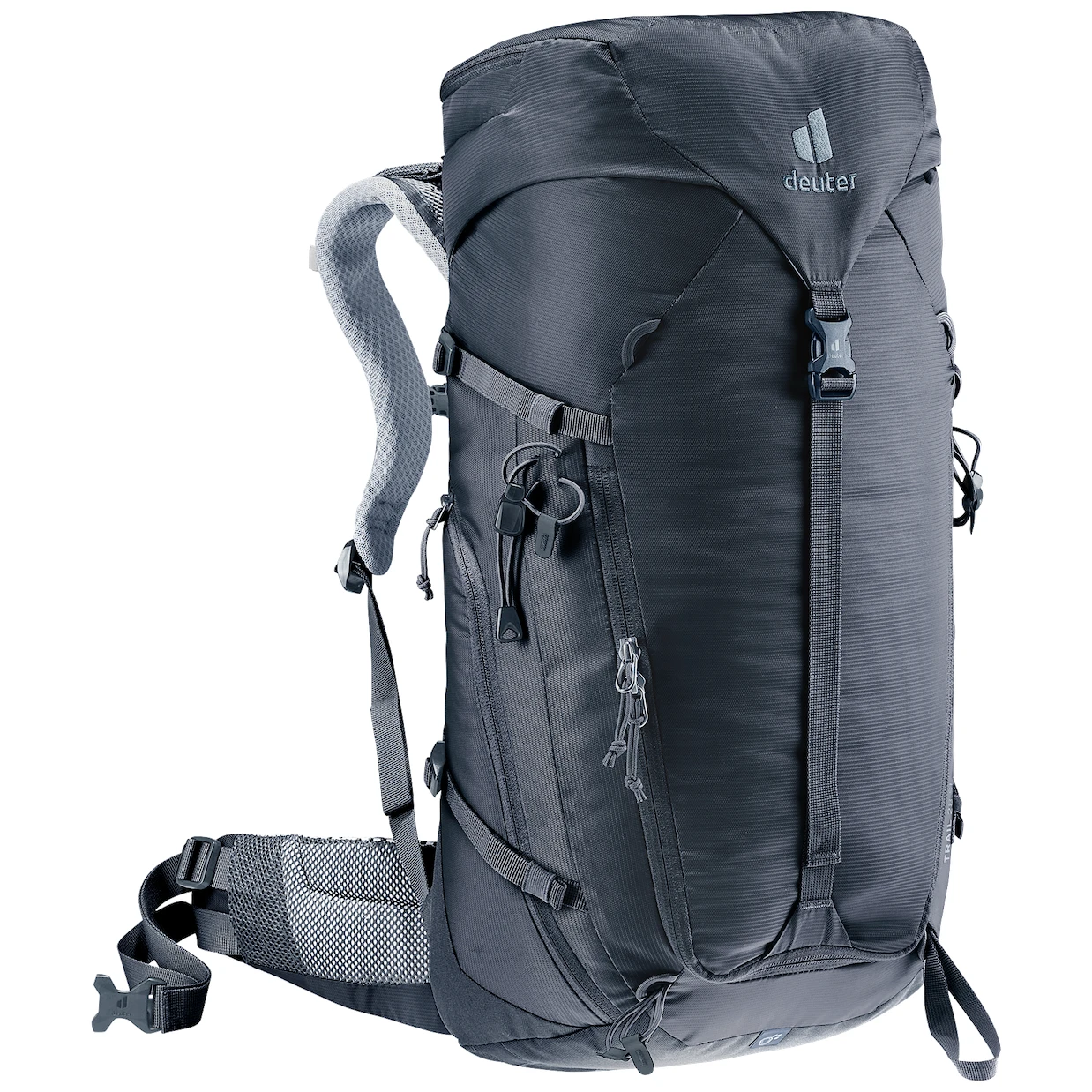 Curele de umăr perforate Active Se potrivesc cu margini moi care oferă ochi pe care puteți atașa carabiniere în pasajele de mers și le puteți declipsa convenabil înainte de a vă îmbarca și de a începe să urcați. Curelele de compresie integrate sunt o caracteristică de confort binevenită, trebuie doar să trageți de mânerele laterale și rucsacul se retrage. Rucsacul oferă, de asemenea, o centură de talie mobilă pentru fixarea rucsacului împreună cu o centură de piept reglabilă. Există, de asemenea, o etichetă SOS, 2 suporturi pentru topor, un clip pentru chei și o pelerină de ploaie.