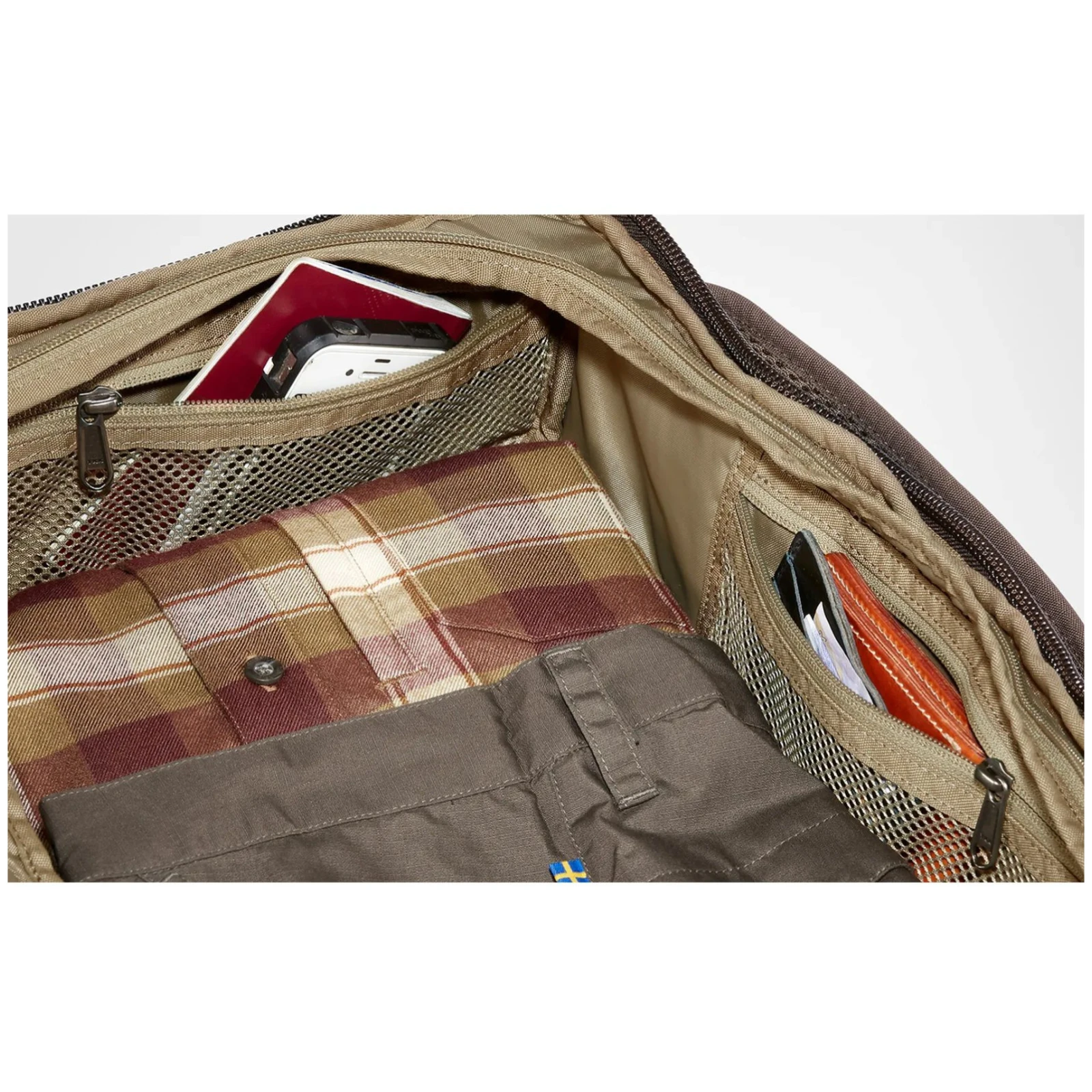 Buzunarele laterale cu fermoar din plasă mențin conținutul la un loc și asigură o mai bună vizibilitate, chiar și atunci când sacul nu este complet plin, și permit împachetarea separată, de exemplu, a lenjeriei sau a echipamentului umed. Este echipat cu trei buzunare interioare din plasă pentru depozitarea obiectelor mici și două buzunare exterioare cu fermoar. Mânerele mari de la fiecare capăt facilitează transportul. Fermoarul principal poate fi fixat cu un lacăt (nu este inclus). Volumul este de aproximativ 35 l.
