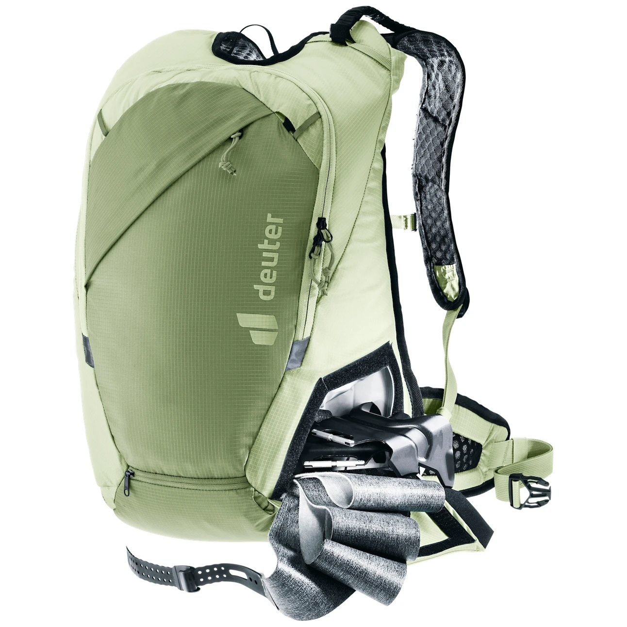 Rucsacul este fabricat din poliamidă ușoară și puternică, cu tehnologie ripstop foarte rezistentă la abraziune. Accesul la interior este asigurat de un fermoar de înaltă calitate și de o deschidere mare. În compartimentul principal veți găsi un compartiment pentru rezervorul de apă (3 L), un buzunar consolidat pentru lama și mânerul lopeții și curele pentru sonda de avalanșă. La exterior este dotat cu un buzunar cu fermoar, pe partea laterală are un buzunar pentru benzile de skialp sau crampoane, la care puteți ajunge fără a fi nevoie să scoateți rucsacul. Buclele permite fixarea pioletului, iar plasa integrată pentru cască este ascunsă în spatele fermoarului. Sistemul de fixare diagonală a schiurilor cu eliberare rapidă este foarte confortabil și, din nou, nu este nevoie să vă scoateți rucsacul.