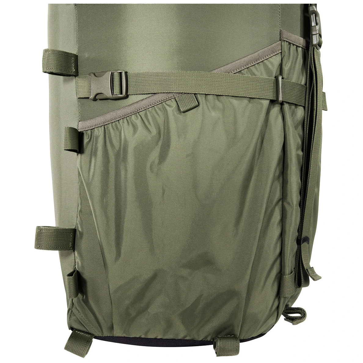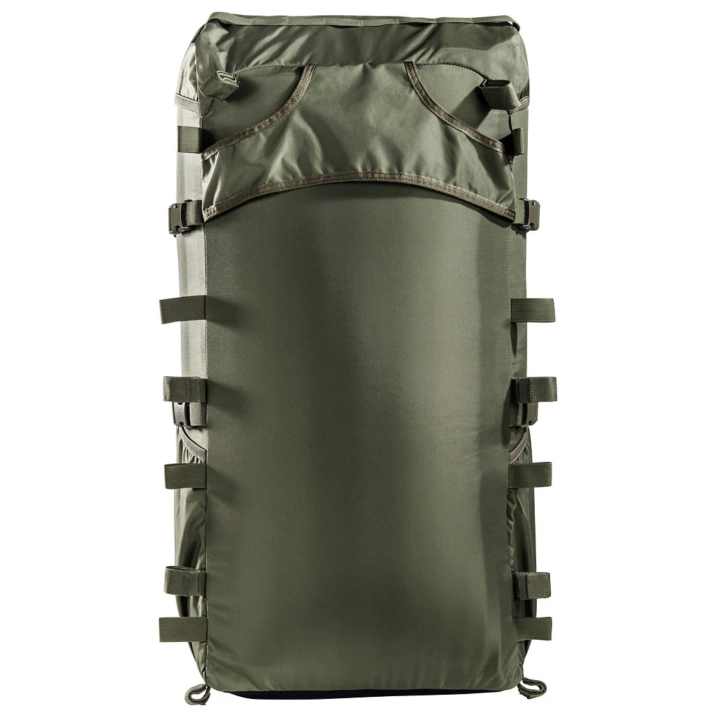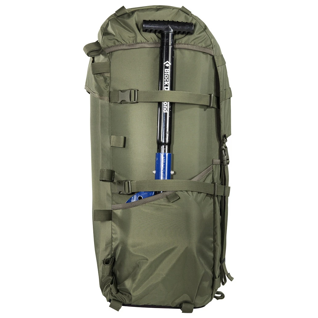 Oferă buzunare mari pe laterale și în partea din față, bucle pentru materiale pe capac și pe partea din față și o clapetă practică de zăpadă cu șnur sub capac. Datorită curelelor de compresie, încărcătura poate fi strânsă ferm și se asigură stabilitatea în timpul transportului.