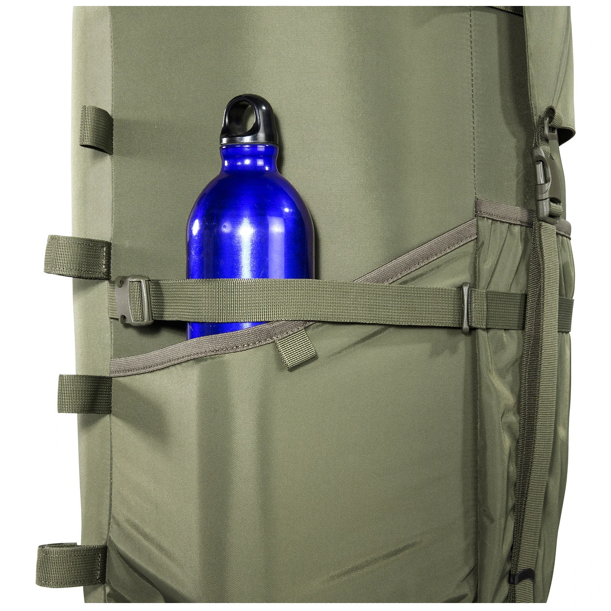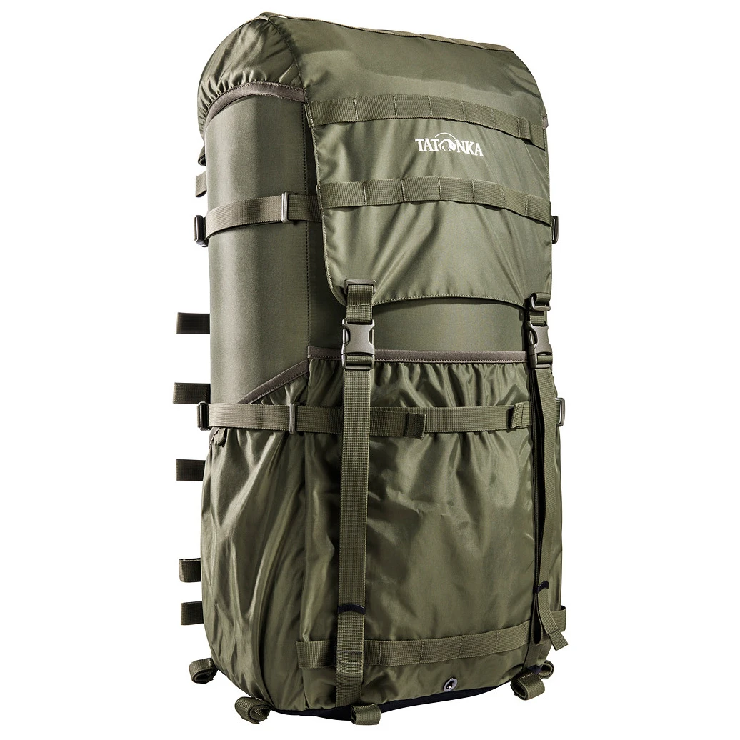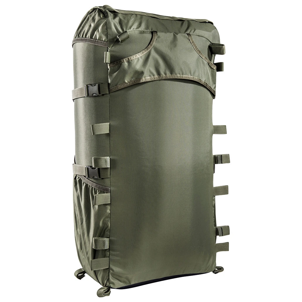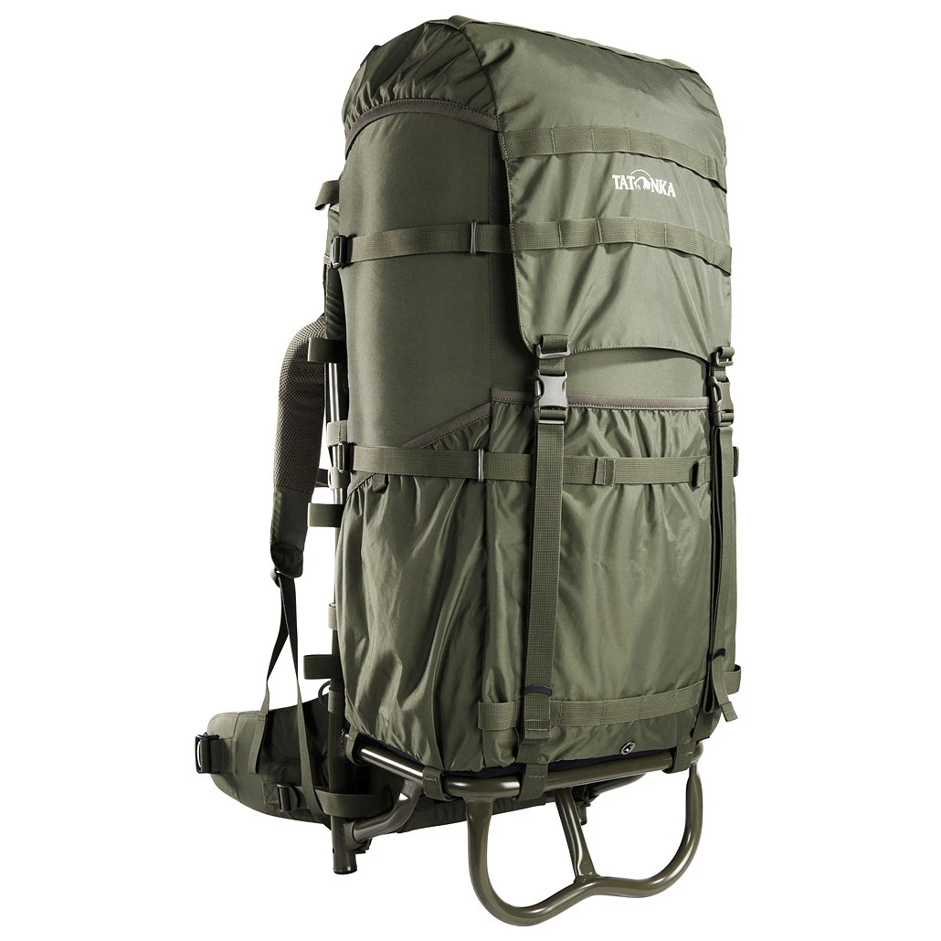 Oferă buzunare mari pe laterale și în partea din față, bucle pentru materiale pe capac și pe partea din față și o clapetă practică de zăpadă cu șnur sub capac. Datorită curelelor de compresie, încărcătura poate fi strânsă ferm și se asigură stabilitatea în timpul transportului.