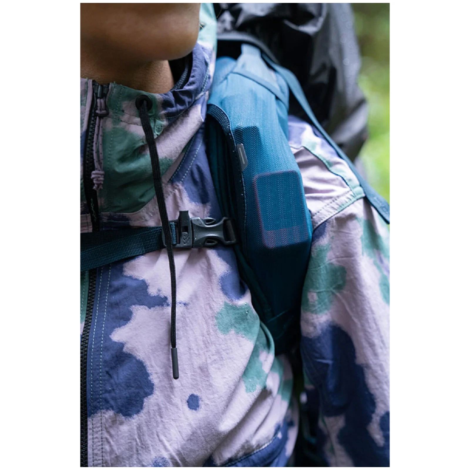 Curelele de compresie de pe partea laterală a rucsacului pot fi conectate și utilizate pentru a atașa orice echipament. Pe rucsac există și bucle pentru panoul solar, bucle pentru bețe de trekking sau piolet, sau o buclă cu elastic pentru ochelari de soare pe breteaua de umăr.