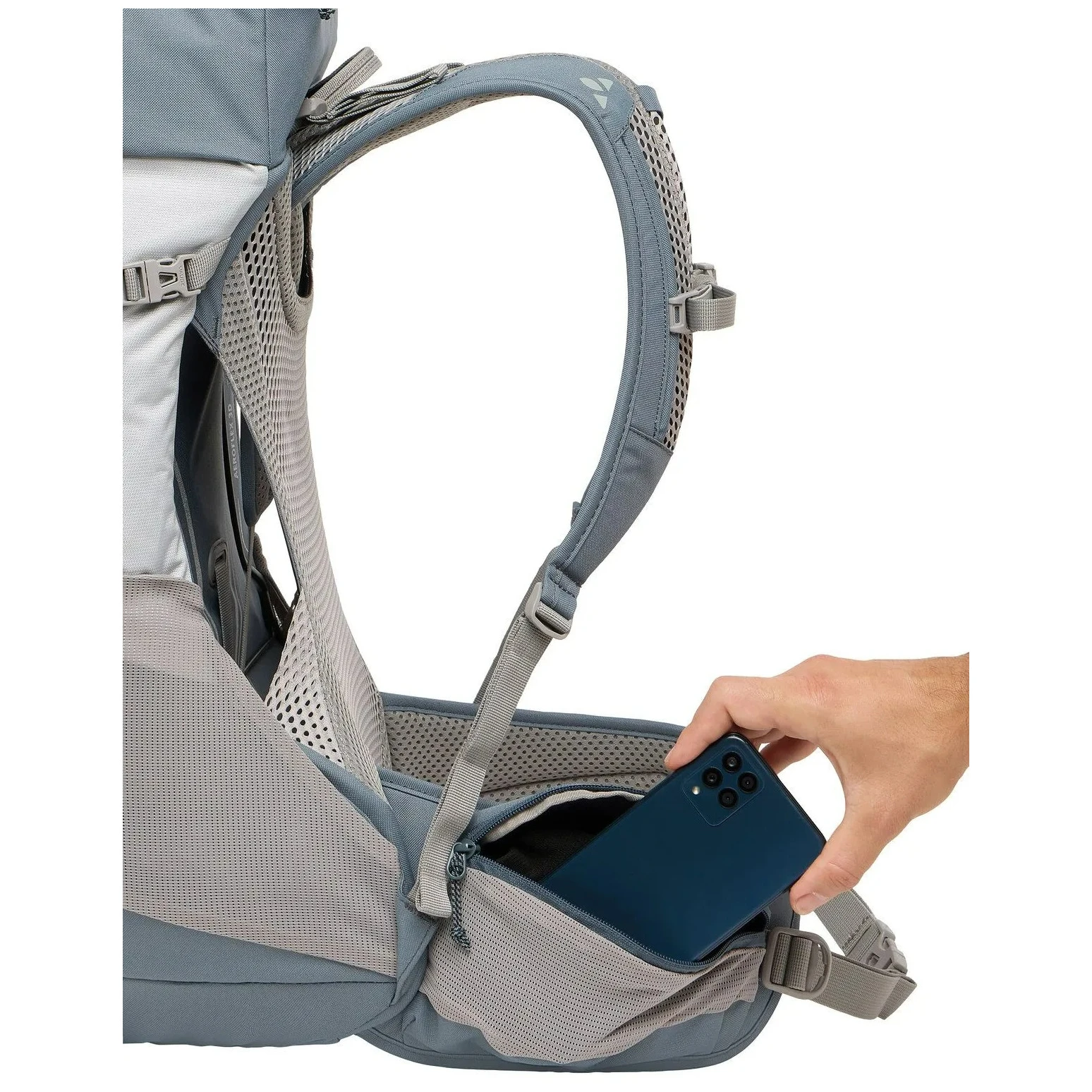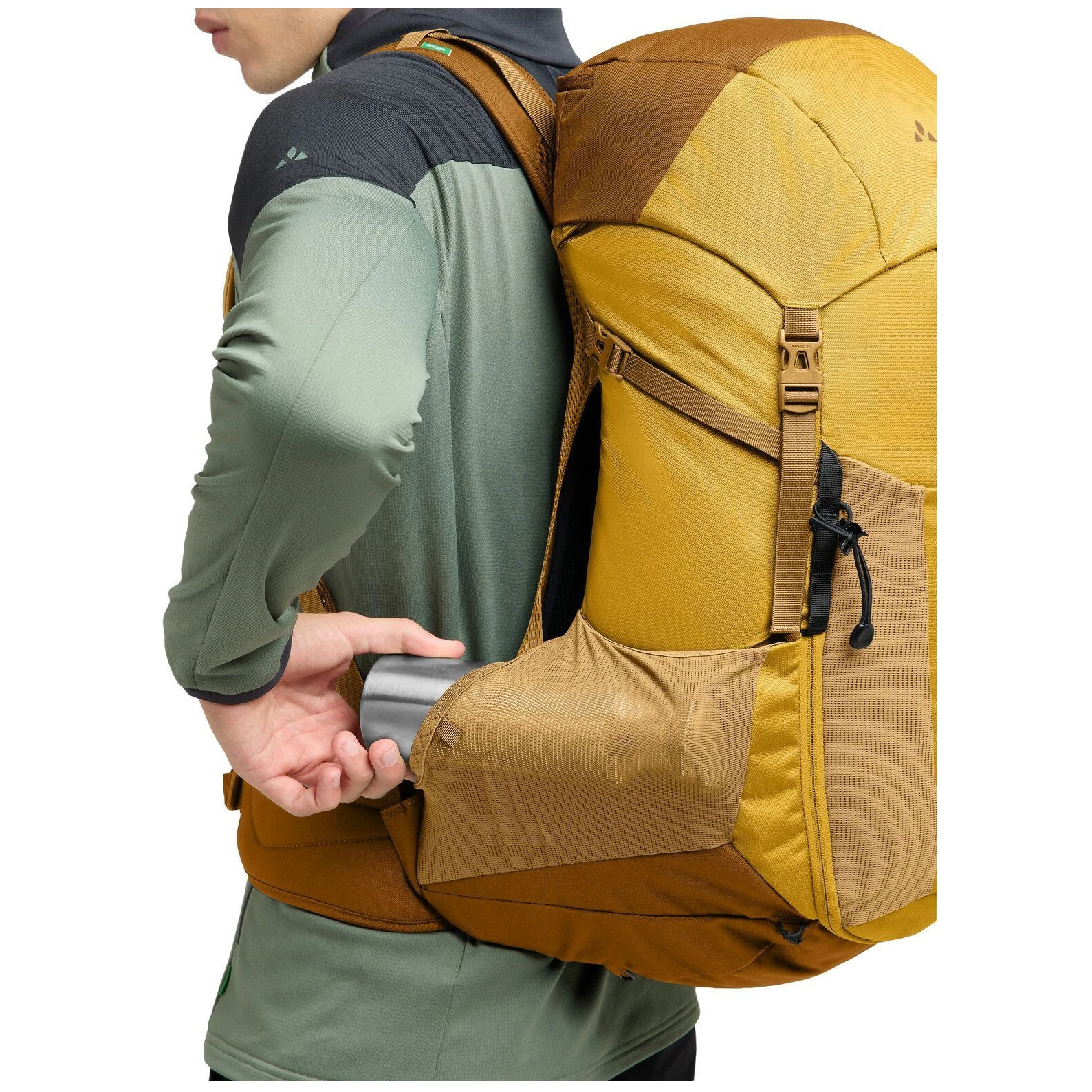 Aripioarele de șold cu buzunar cu fermoar asigură stabilitate și transport sigur al încărcăturii. Materialul Eco Finish este rezistent la apă și murdărie fără PFC și este fabricat din PET reciclat. Eticheta VAUDE Green Shape garantează o producție ecologică și funcțională.