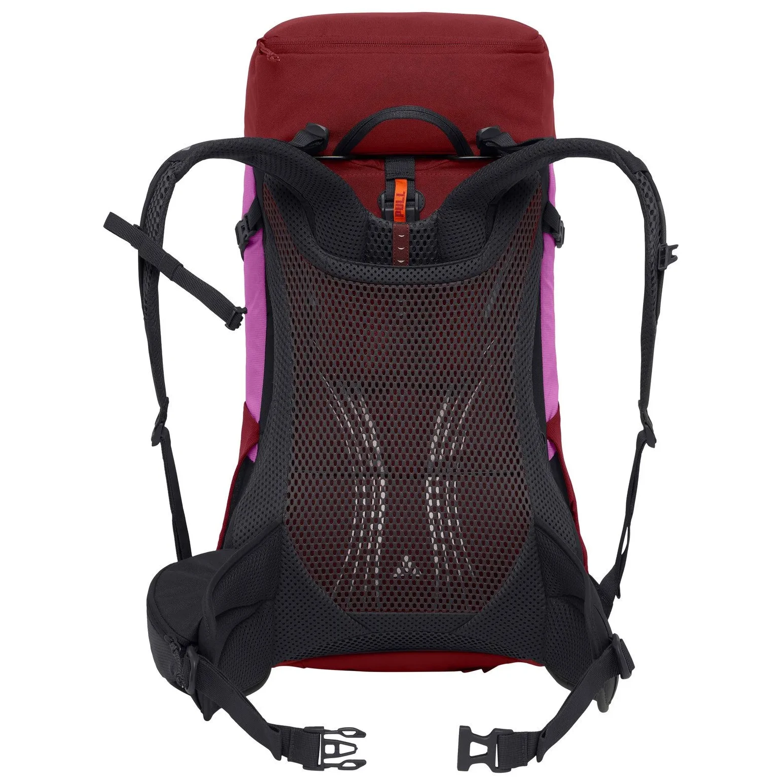 Funcțiile practice includ un acces frontal către compartimentul principal, buzunare laterale elastice, buzunar pe capac, compartiment pentru obiecte de valoare, suport pentru bețe de trekking, husă de ploaie integrată detașabilă și curea toracică cu suport pentru furtunașul de hidratare. Materialul exterior este tratat cu Eco Finish fără PFC și fabricat din sticle PET reciclate, certificat VAUDE Green Shape, combinând ecologia cu funcționalitatea ridicată.
