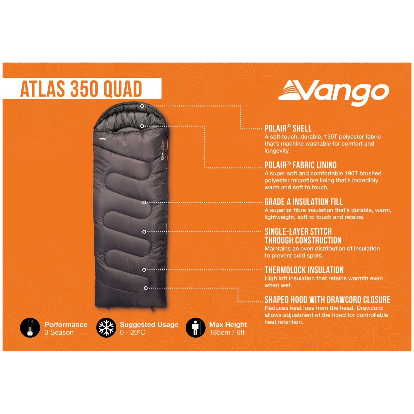 Sacul de dormit Atlas 350 Quad de la producătorul Vango este conceput pentru toți cei care doresc confortul de acasă chiar și atunci când campează în natură. Datorită formei pătrate (Quad), oferă mai mult spațiu de mișcare, lucru pe care îl veți aprecia în special în timpul șederilor mai lungi în camping, a vacanțelor de familie sau în timpul sezonului festivalurilor. Croiala generoasă sporește confortul somnului și, în același timp, ajută la menținerea unei temperaturi stabile pe tot parcursul nopții.