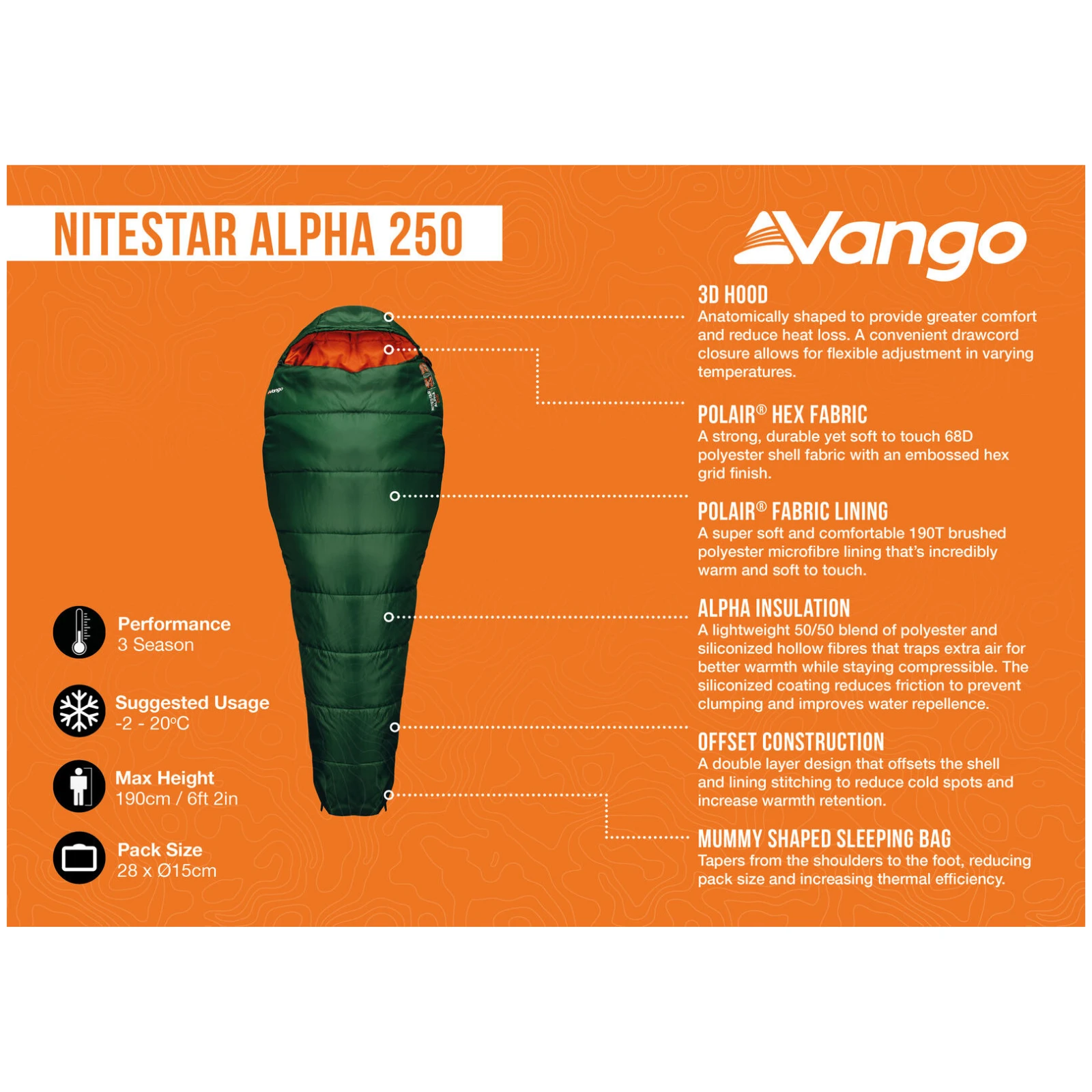 Vango Nitestar Alpha 250 este unul dintre cei mai populari saci de dormit de la Vango și, pe termen lung, face parte din echipamentul dovedit al entuziaștilor de activități în aer liber. Oferă un raport excelent între confort termic, greutate și compresibilitate, fiind astfel potrivit pentru o gamă largă de activități – de la camping la expediții mai solicitante. Nu este o coincidență faptul că face parte din echipamentul recomandat pentru expedițiile Duke of Edinburgh’s Award.