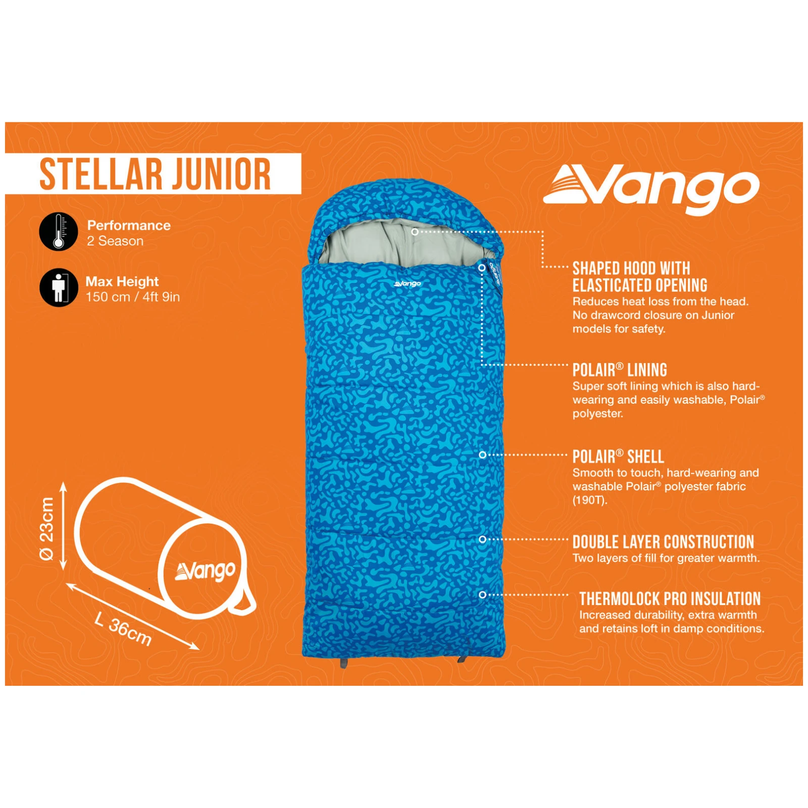 Sacul de dormit Stellar Junior Vango este conceput special pentru copii și persoane de statură mică, pentru a le oferi suficientă căldură, confort și siguranță în nopțile petrecute în natură. Datorită mărimii junior, sacul de dormit copiază mai bine corpul mic, minimizează pierderile de căldură și ajută la menținerea unui confort termic optim pe tot parcursul nopții.