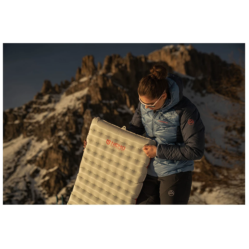 Salteaua gonflabilă Nemo Tensor All-Season este proiectată pentru a oferi proprietăți termice și stabilitate excelente, fără greutate suplimentară inutilă. Utilizează un design Spaceframe™ unic, care oferă suport stabil și o distribuție optimă a greutății. Două straturi ultra-subțiri, Thermal Mirror™ reflectă eficient căldura corpului și elimină zgomotul foșnitor asociat adesea cu saltelele gonflabile.