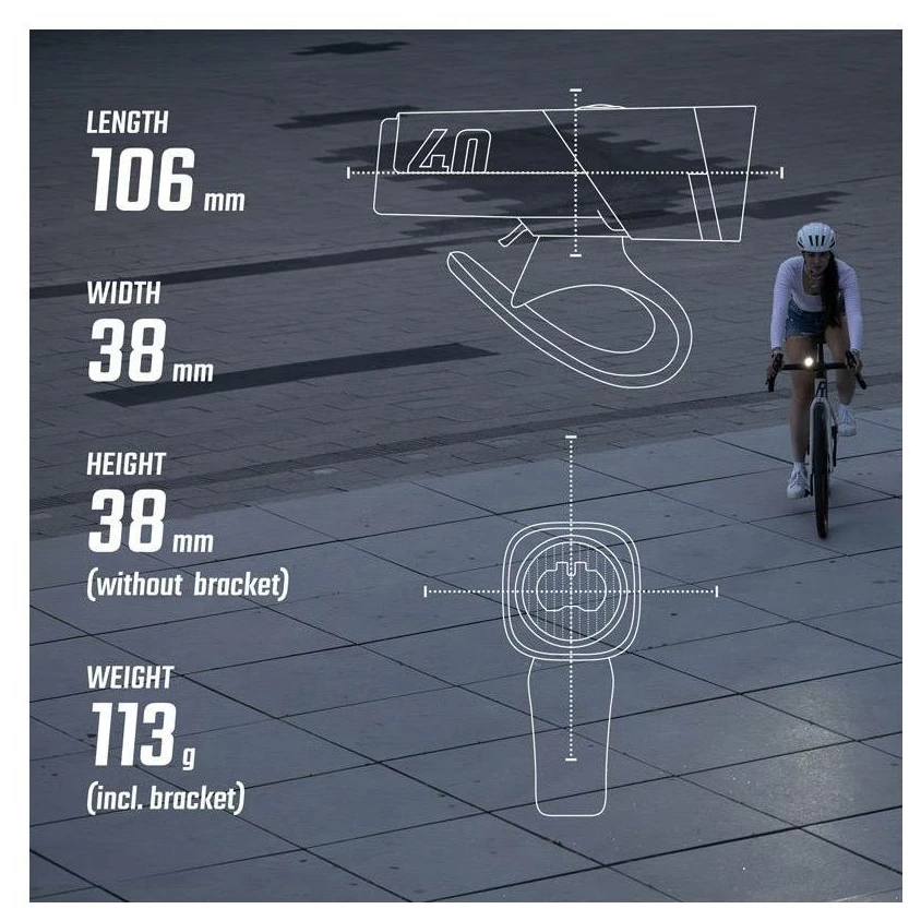 - Lumina frontală AURA 40: intensitate 40 de lucși, rază de acțiune de până la 50 m, autonomie de până la 29 de ore