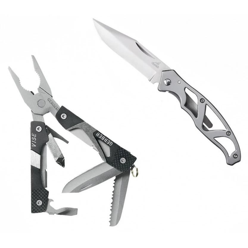 Set convenabil de clești multifuncționali mici Gerber Vise și cuțit de buzunar cu lama netedă Gerber Paraframe Mini.