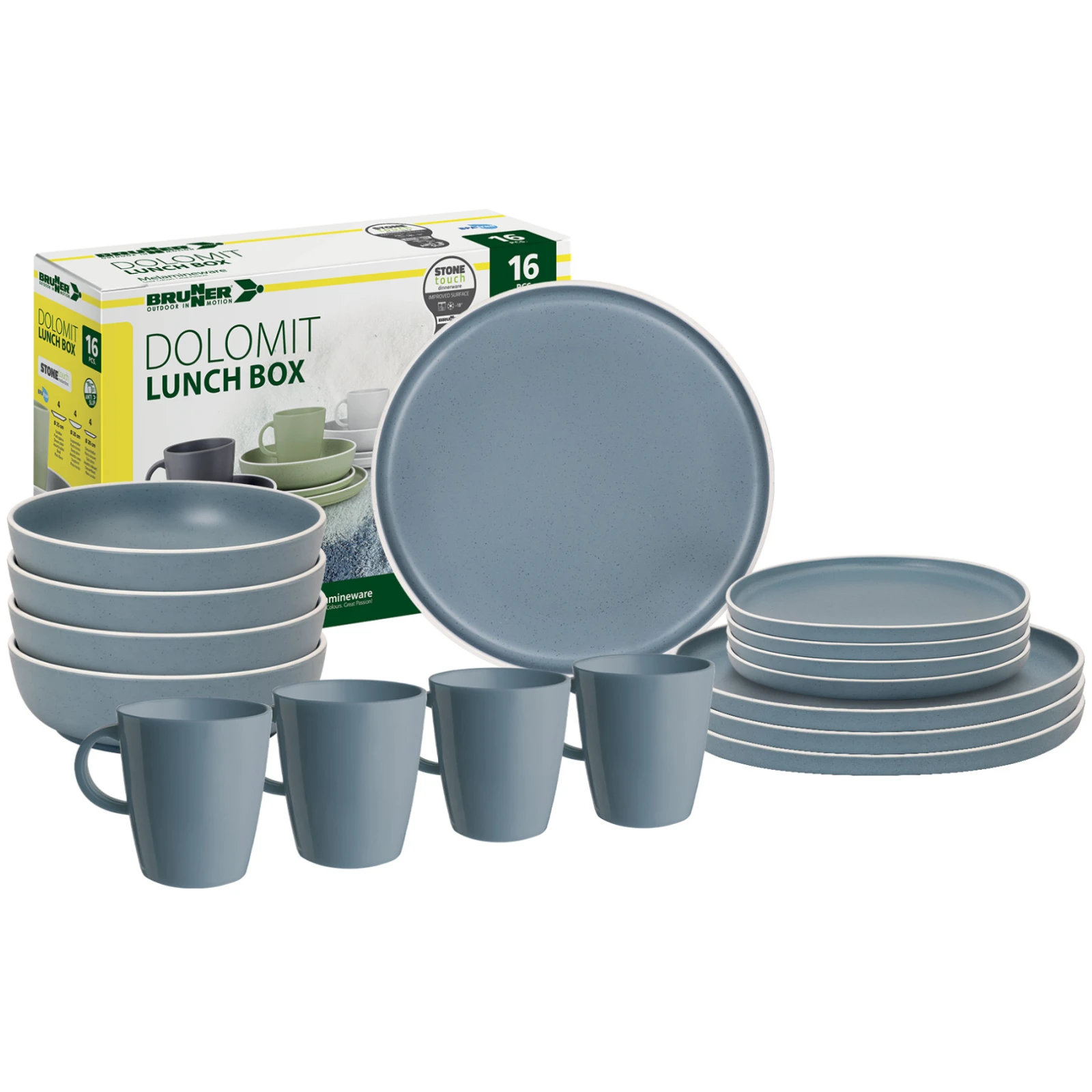 Setul de vase Dolomit Lunch Box de la brandul Brunner conține echipamentul esențial pentru camping. Setul este format din 16 piese și este potrivit pentru 4 persoane. Este confecționat din melamină. Acest material este rezistent la impact, ușor de curățat, rezistent la căldură și umiditate, inodor, insipid și ecologic. Vasele pot fi puse în congelator și în mașina de spălat vase.