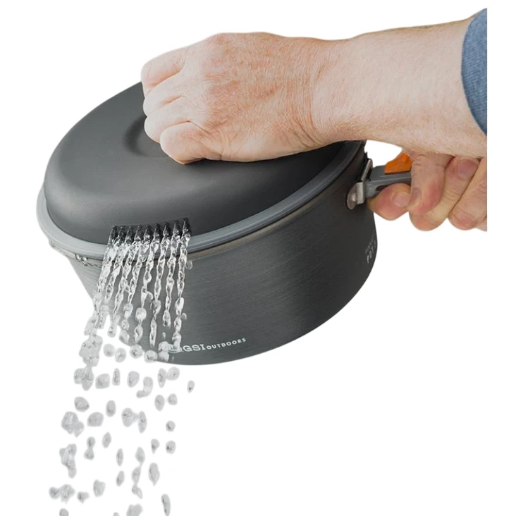 Pinnacle Ceramic Camper de la GSI Outdoors este un set de veselă ingenios conceput, care se adaptează nevoilor atât ale unei echipe de trekking de doi, cât și ale unei familii de patru persoane în camping. Conține tot ce este necesar pentru gătit și servit – două oale (2 și 3 litri) cu capace de strecurare, o tigaie, căni cu termobloc, boluri, farfurii și accesorii diferențiate pe culori pentru o identificare ușoară a seturilor individuale.