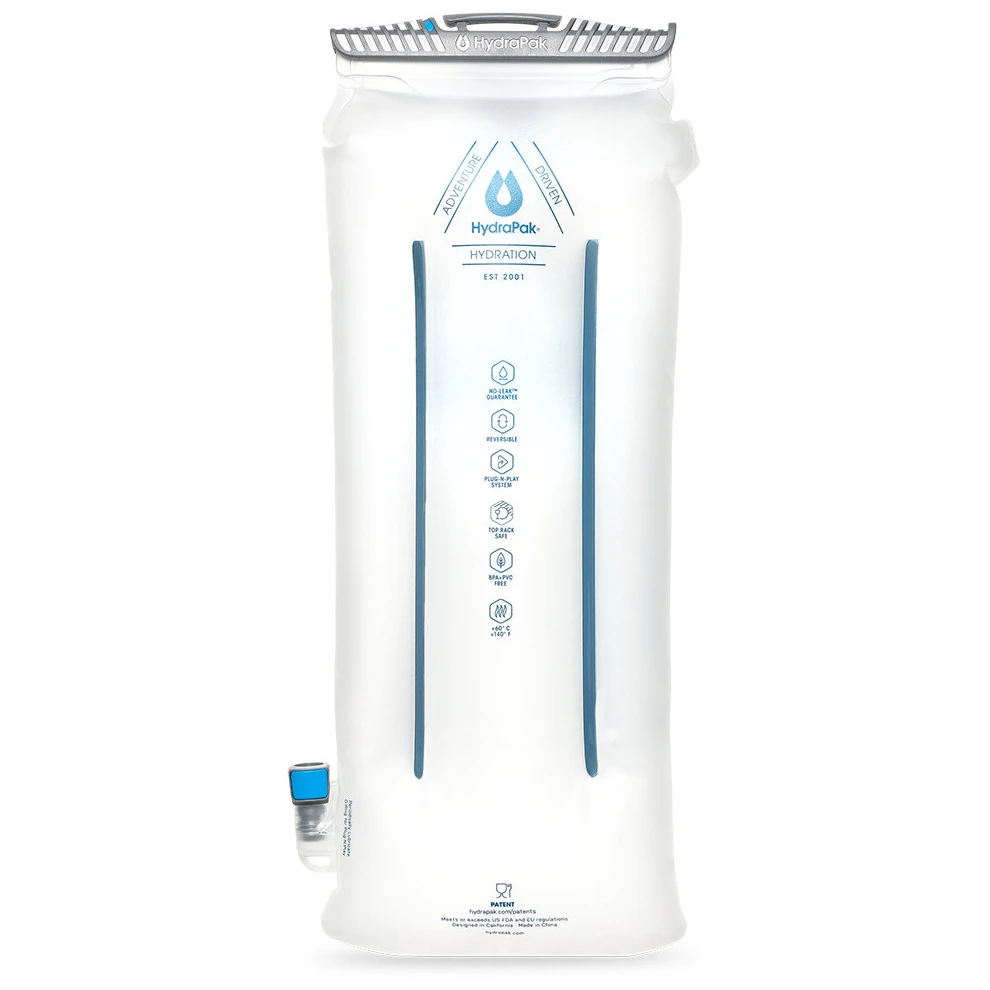 Chiar și după umplere, rezervorul își menține forma îngustă și nu apasă nicăieri în rucsac. Este proiectat astfel încât să nu existe scurgeri de apă în timpul umplerii, consumului, transportului sau manipulării. Se curăță ușor, poate fi întors complet pe dos și spălat în mașina de spălat vase.