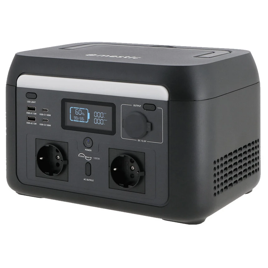 Stația de încărcare Mestic MPS-1000 oferă suficientă energie pentru toate aventurile tale departe de rețeaua electrică. Cu o putere de 1000 W (maxim până la 1600 W) și o capacitate de 614 Wh, poate alimenta orice, de la lumini și laptopuri până la aparate de bucătărie mai mici. Este disponibilă o gamă variată de conectori de ieșire – AC, DC, USB-A și USB-C – astfel încât să puteți conecta toate dispozitivele necesare. Datorită regulatorului încorporat, puteți încărca în siguranță stația de încărcare cu un panou solar și puteți utiliza o sursă regenerabilă de energie oriunde călătoriți. Încărcarea rapidă asigură o încărcare completă în doar 75 de minute. În ciuda performanței sale, dispozitivul rămâne ușor de transportat – cântărește doar 8,5 kg. Puteți controla totul convenabil cu ajutorul aplicației Mestic prin Bluetooth sau Wi-Fi.