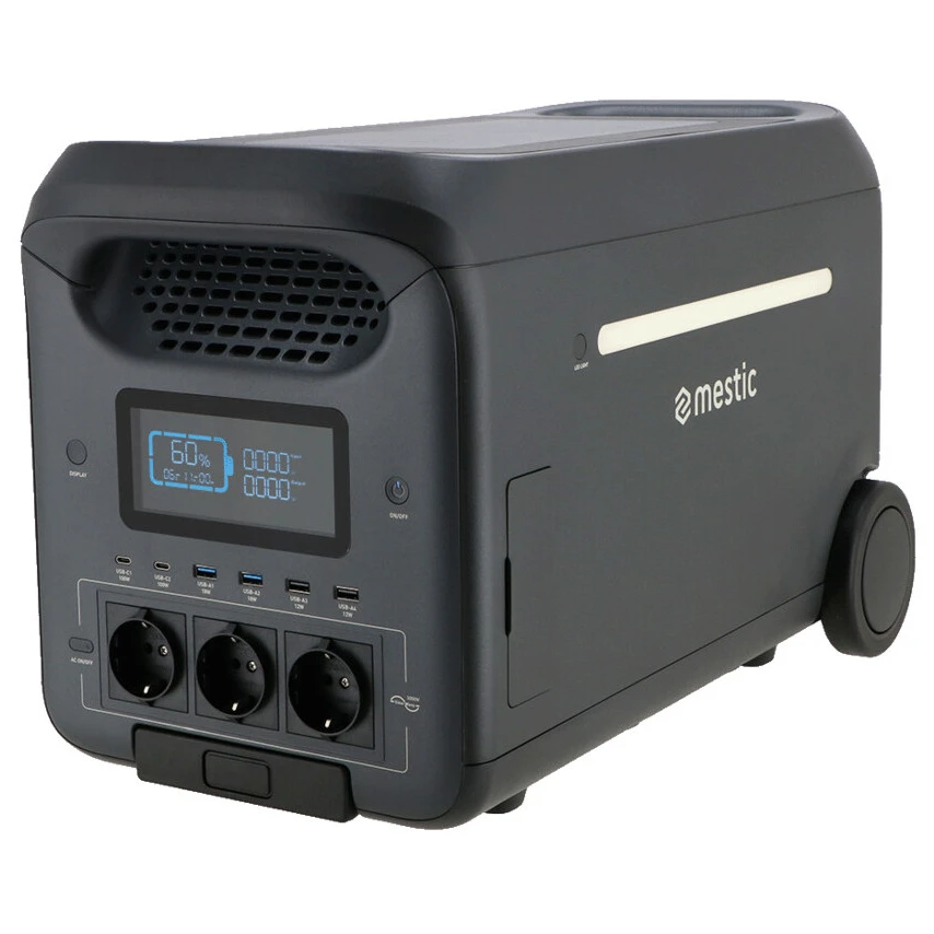 Cel mai puternic model din gama powerstation Mestic – MPS-3000 – este soluția ideală pentru rulote, caravane sau sejururi lungi departe de civilizație. Datorită puterii de 3000 W (vârf de până la 5000 W) și a capacității de 2560 Wh puteți alimenta aparate electrocasnice obișnuite, chiar și mai multe simultan. Conectarea este posibilă prin diverși conectori: AC, DC, USB-A și USB-C, astfel încât puteți încărca cu ușurință orice, de la telefon la aragaz electric.