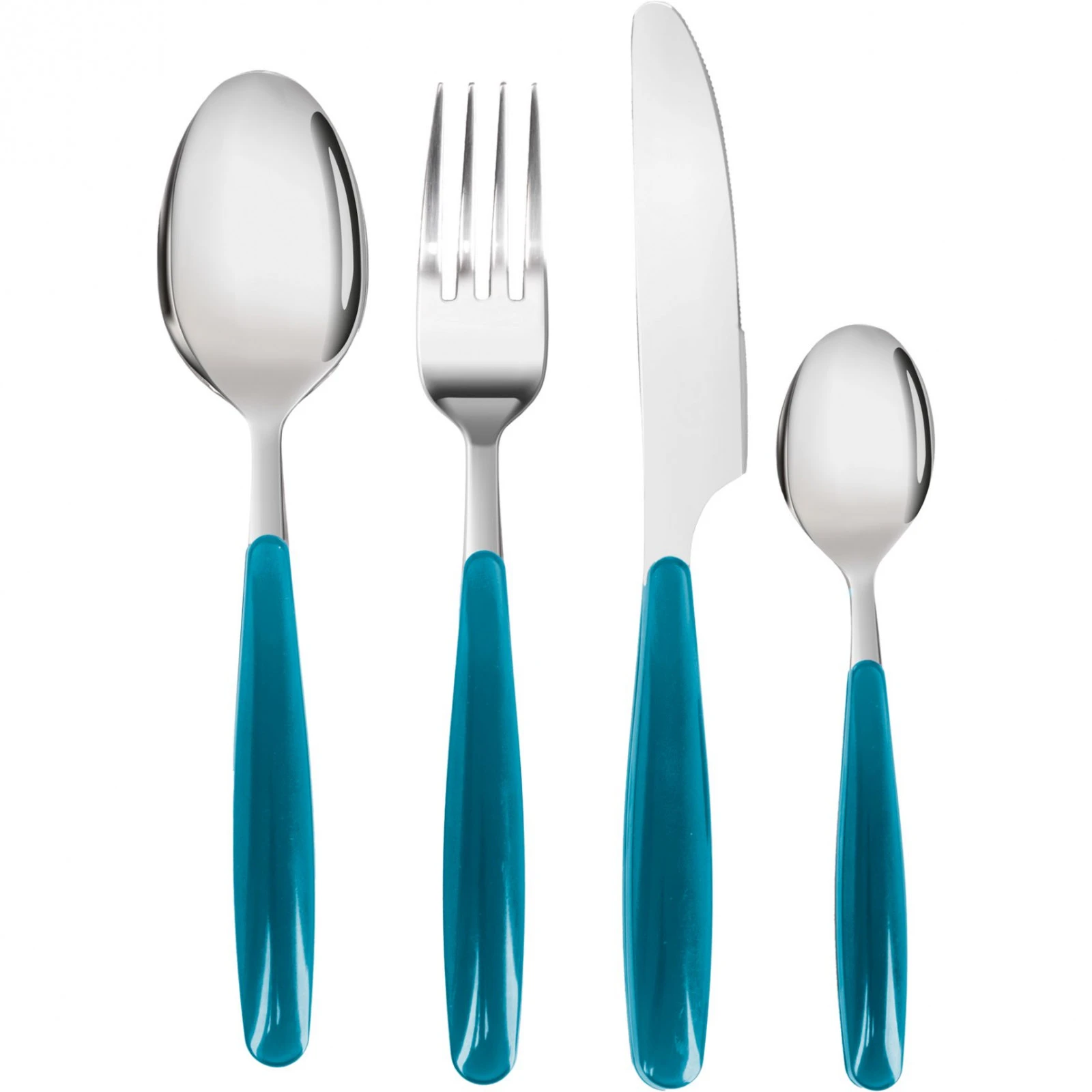 set de tacâmuri Brunner Sapora 16 piese cu design modern din miez solid din oțel inoxidabil și mânere din plastic frumos conturate. Este potrivit atât pentru casă, cât și pentru camping.