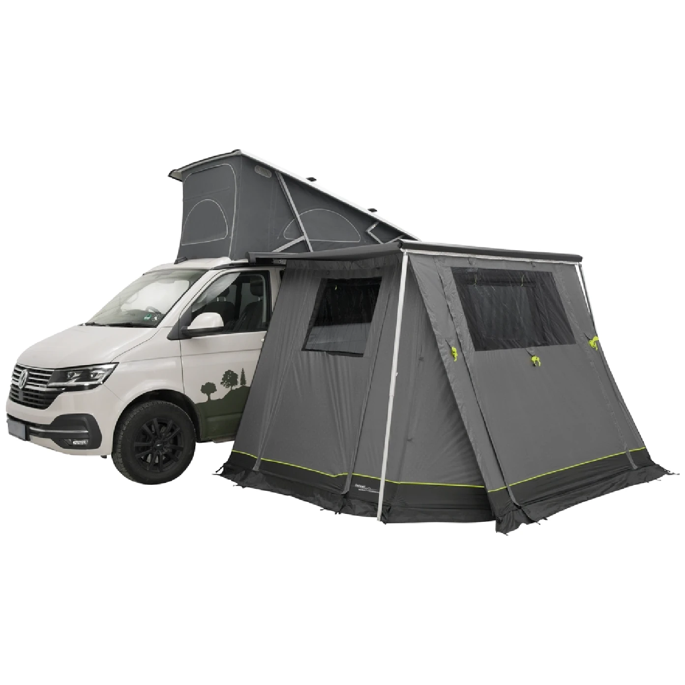 Suportul se fixează direct pe copertină cu ajutorul șinelor cu șnur de 5 și 7 mm. Învelișul adăpostului este fabricat din material impermeabil Outtex® 4000 Select, care vă protejează chiar și pe vreme rea. Pereții laterali au ferestre mari nuanțate, care luminează suficient interiorul suportului, dar oferă și intimitate datorită draperiilor. Corzile reflectorizante de ancorare preinstalate mențin prelată la locul ei chiar și pe vreme nefavorabilă. Suportul este ușor de împachetat și încape confortabil în ușile din spate ale California.