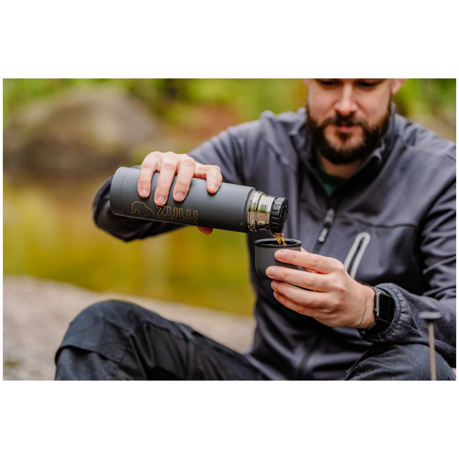 Termosul Zulu Outdoor Vacuum Flask menține băuturile reci sau calde. Vidul dintre cele două învelișuri ale termosului asigură proprietatea de izolare termică. Beneficiază de o cană din oțel inoxidabil echipată cu o inserție din plastic și căptușită cu o margine din plastic.