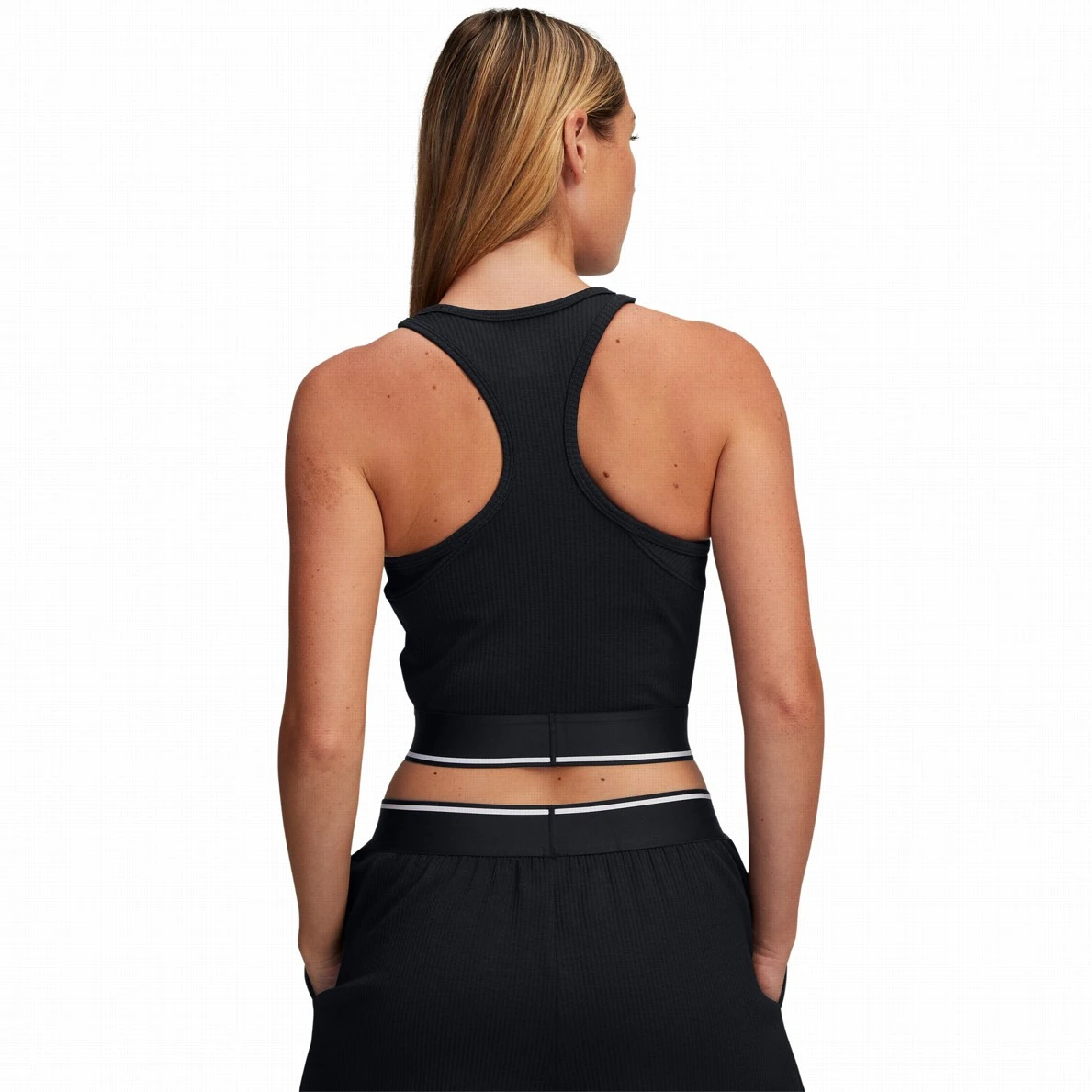 Tehnologia 4-Way Stretch permite mișcarea liberă în orice direcție. Construcția racerback, împreună cu gulerul mai înalt, susține mobilitatea, în timp ce banda elastică largă de la bază, cu detaliu de inscripție, asigură o bună fixare pe corp.