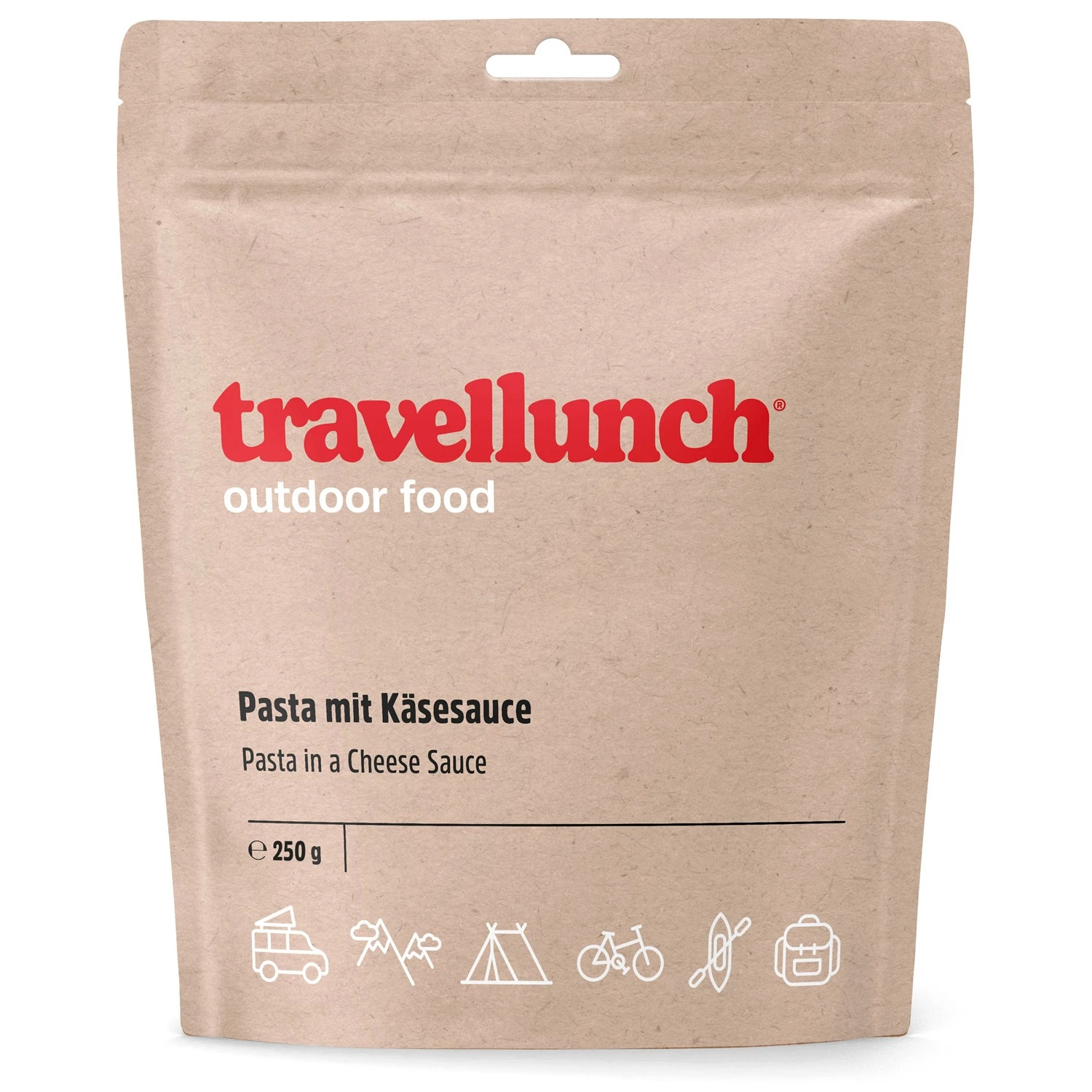Bucurați-vă de o masă copioasă în timpul drumețiilor cu mâncarea Travellunch. Se pregătește rapid și simplu. Se toarnă apă fiartă peste mâncare, se amestecă, se închide punga și se așteaptă 10-15 minute. Valoarea energetică a acestei mâncări este de 1900 kJ = 440 kcal.