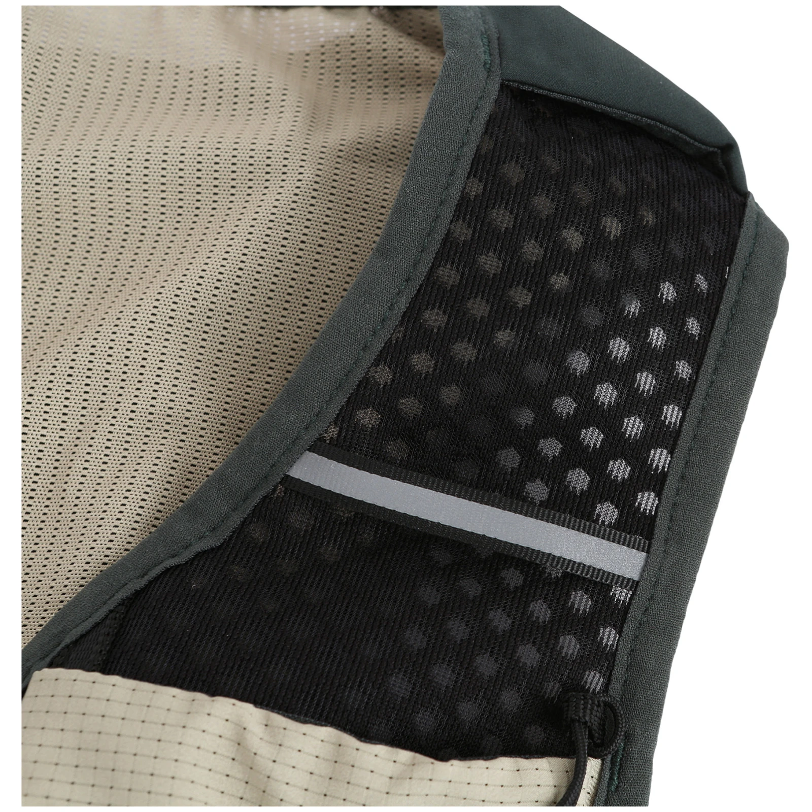 Vesta este fabricată din material mesh respirabil, care asigură o bună ventilație și confort chiar și în timpul efortului intens. Fixarea stabilă pe corp este asigurată de benzi elastice reglabile pentru piept, care se adaptează siluetei și cantității de echipament transportat. În spate se află un buzunar cu fermoar și un buzunar cu velcro, completate de benzi elastice, care pot fi folosite pentru fixarea echipamentului (de exemplu, o jachetă) sau pentru strângerea conținutului buzunarului. Nu lipsește nici spațiul pentru rezervorul de apă, care permite rehidratarea confortabilă în timpul alergării.