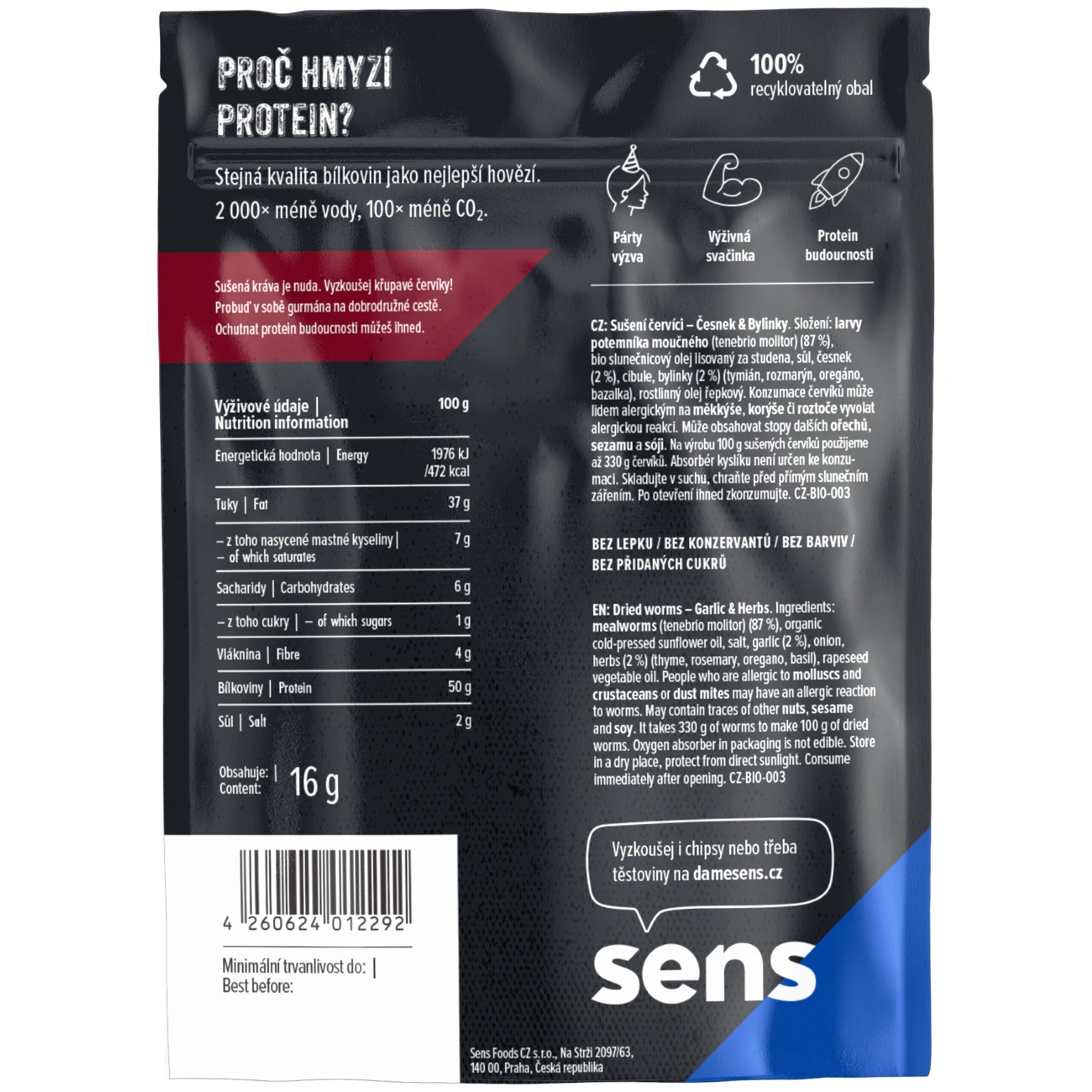 Viermii condimențați Sens Spice Worms cu usturoi și ierburi 12 g sunt o gustare nutritivă potrivită la munte sau acasă în fața televizorului. Pot să condimenteze o petrecere ca un răsfăț neobișnuit și o provocare pentru prieteni. Au un gust cu adevărat surprinzător de bun și crocant.
