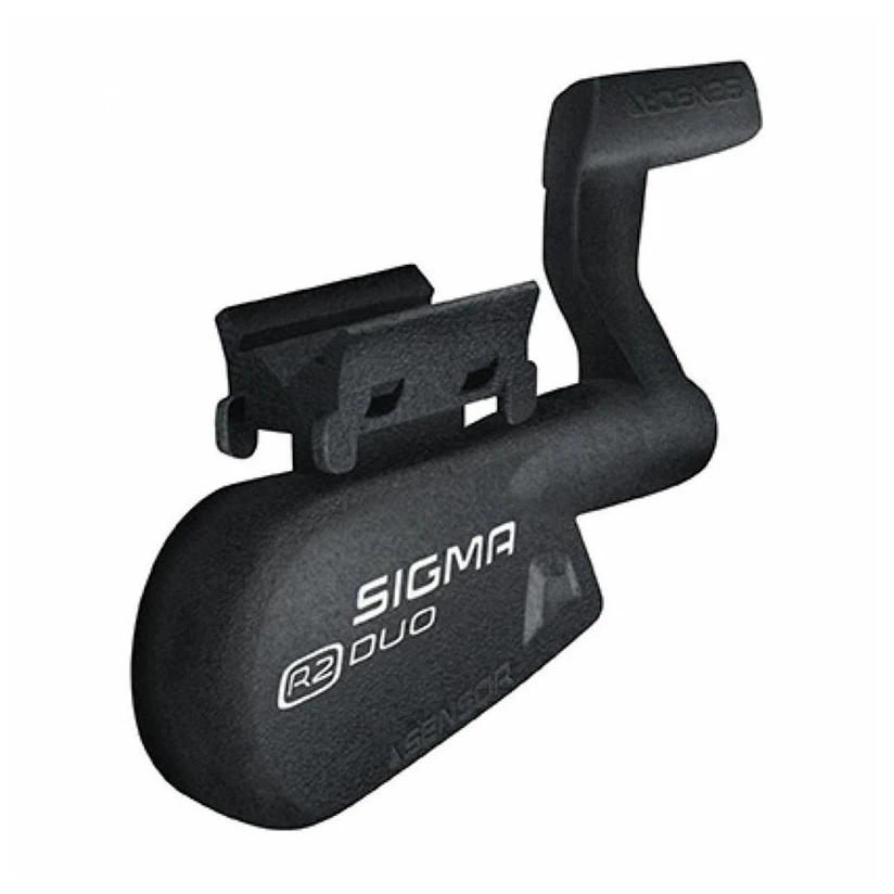 Transmițător wireless Sigma R2 DUO, inclusiv magneți Power și pentru axul pedalei. R2 DUO este un senzor de viteză și cadență, care folosește două tehnologii diferite de transmitere Datele sunt trimise prin ANT+ și Bluetooth. Datele pot fi partajate simultan pe smartphone sau pe un alt dispozitiv compatibil prin Bluetooth Smart sau ANT+.